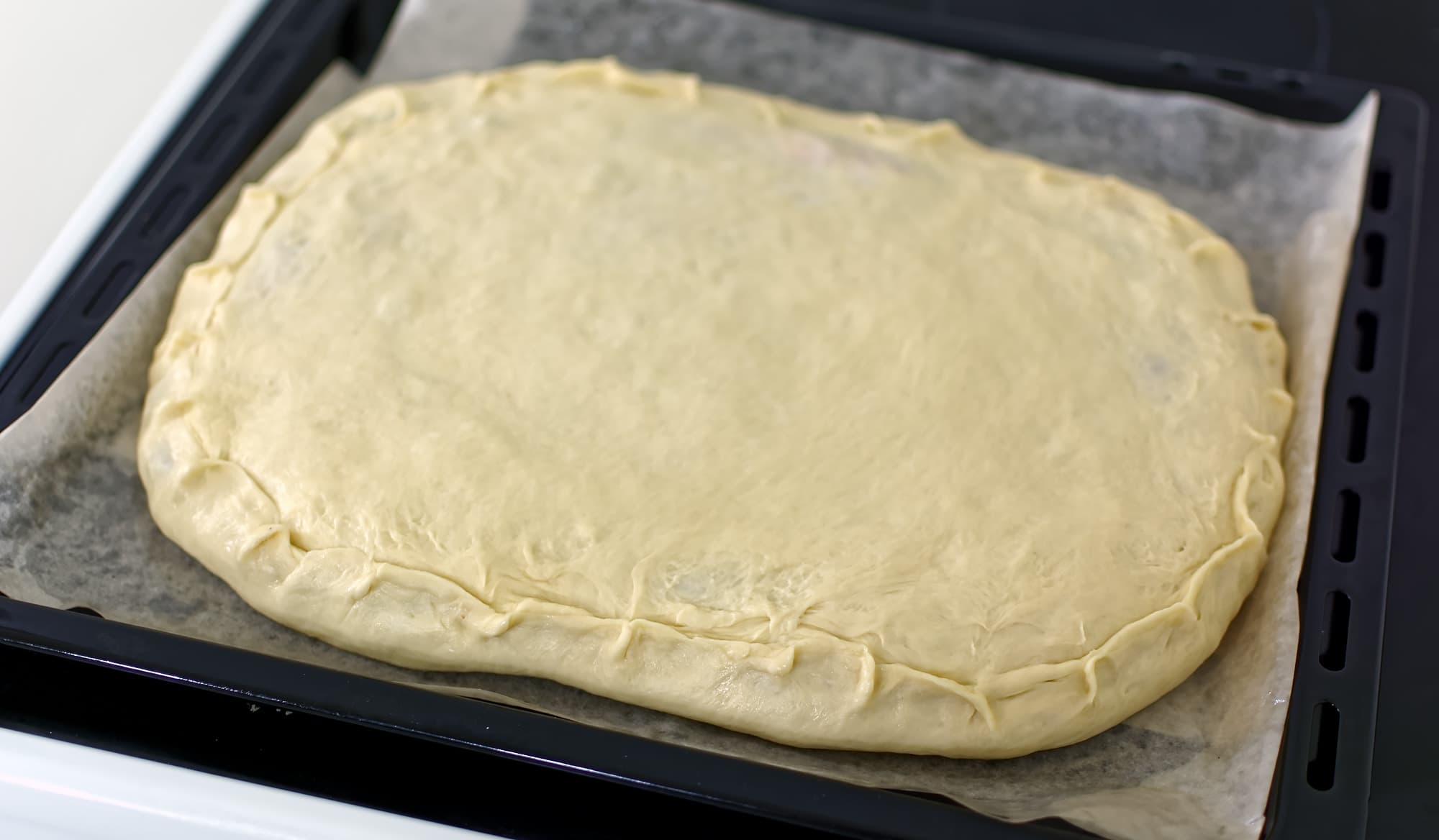 Пока поднималось тесто, курица мариновалась, пропитываясь ароматом лука. Затем бо́льшую часть теста раскатали, сформировав дно пирога, а сверху поместили всю массу начинки. Да, прямо сырой, да, пропечется.