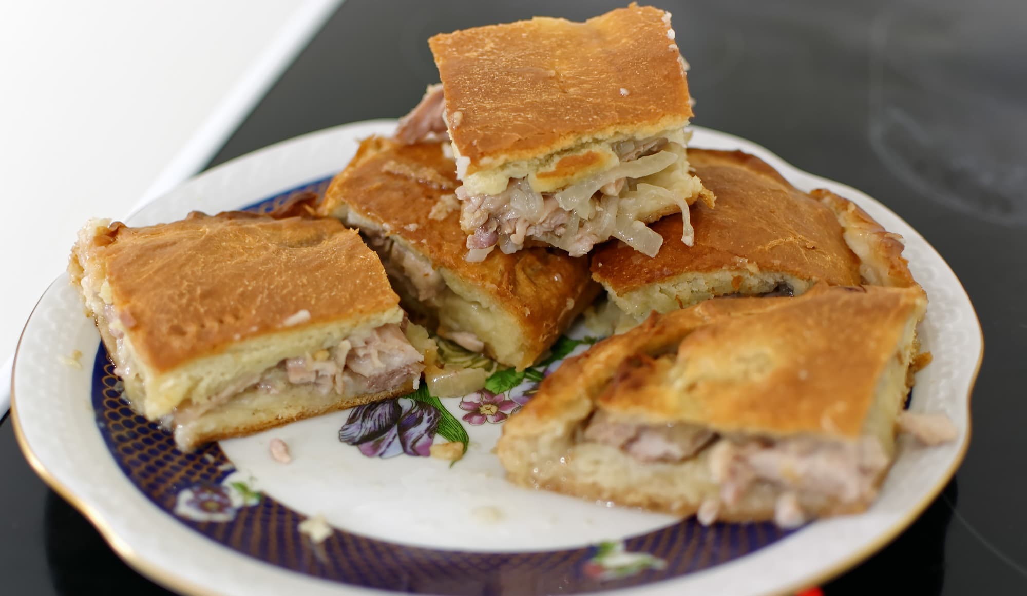 Начинка полностью приготовилась, вкус лука при этом исчез, растаяв в курице и придав ей сочность. Тесто с получилось особенное, с хрустящей корочкой снаружи и нежное, пропитанное куриным соком со стороны начинки.