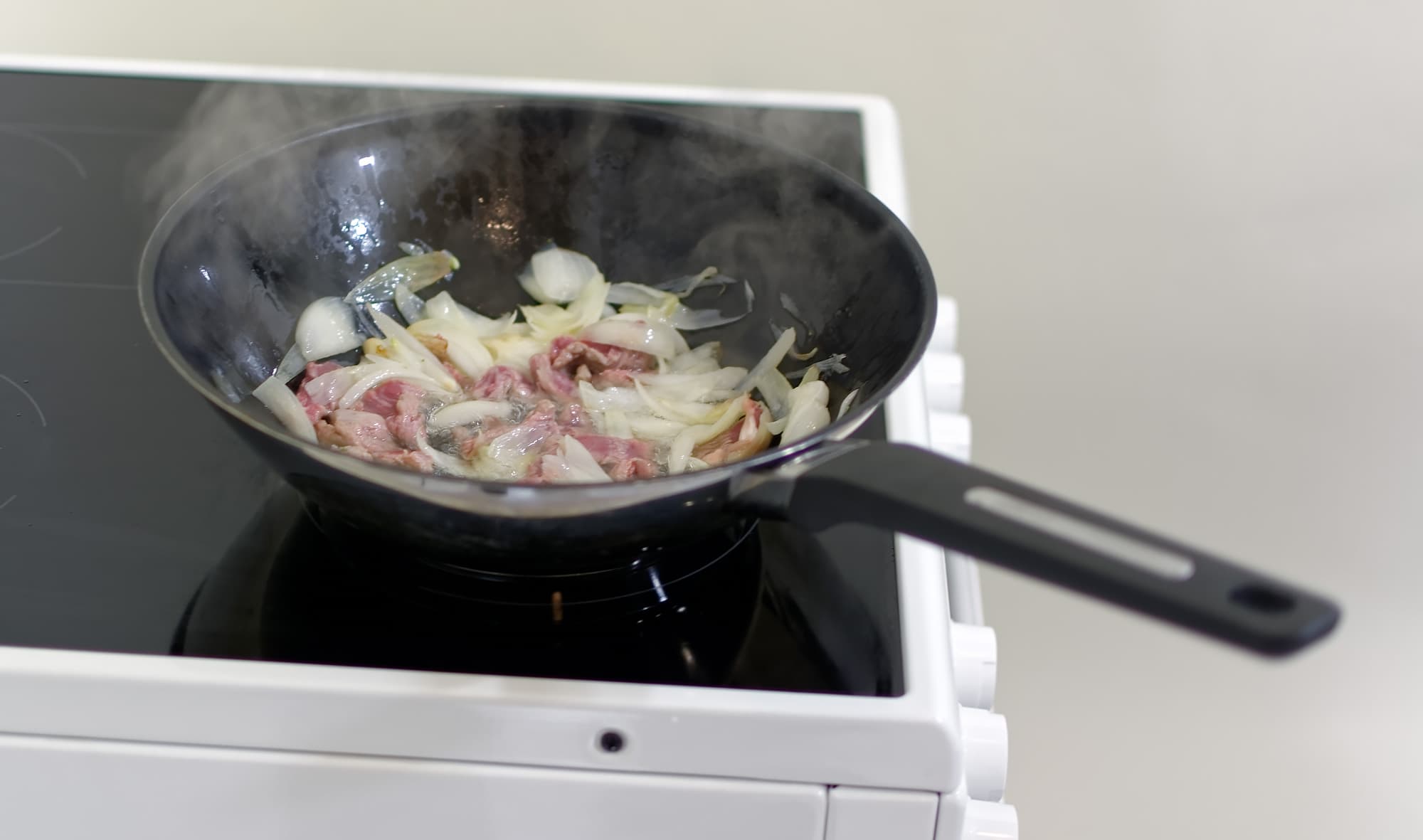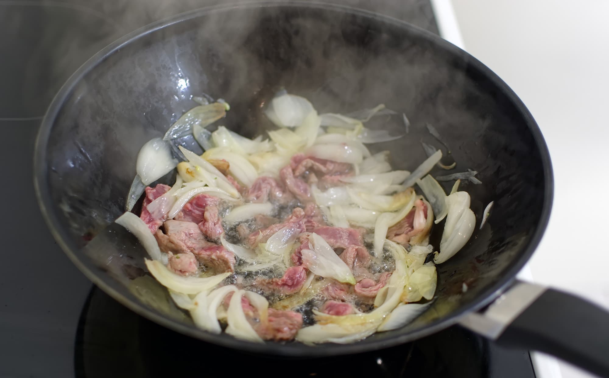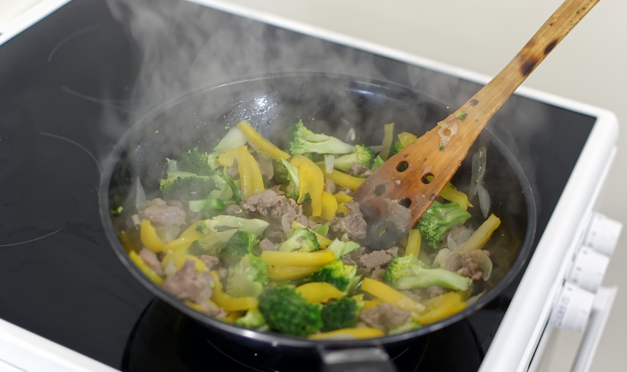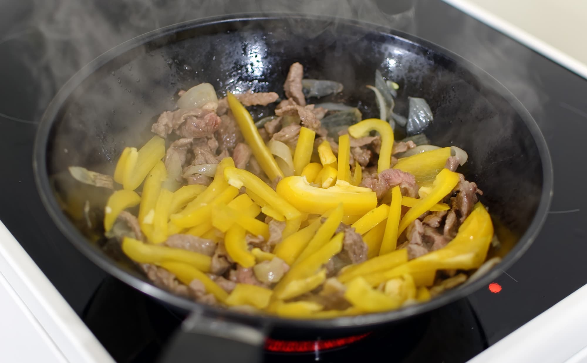 Продолжаем работать с плитой. На этот раз используется самый мощный вариант нагрева круглой посуды: на расширяемой круглой конфорке попытаемся сделать мясо с овощами по технологии стир-фрай, которая требует высокой температуры.