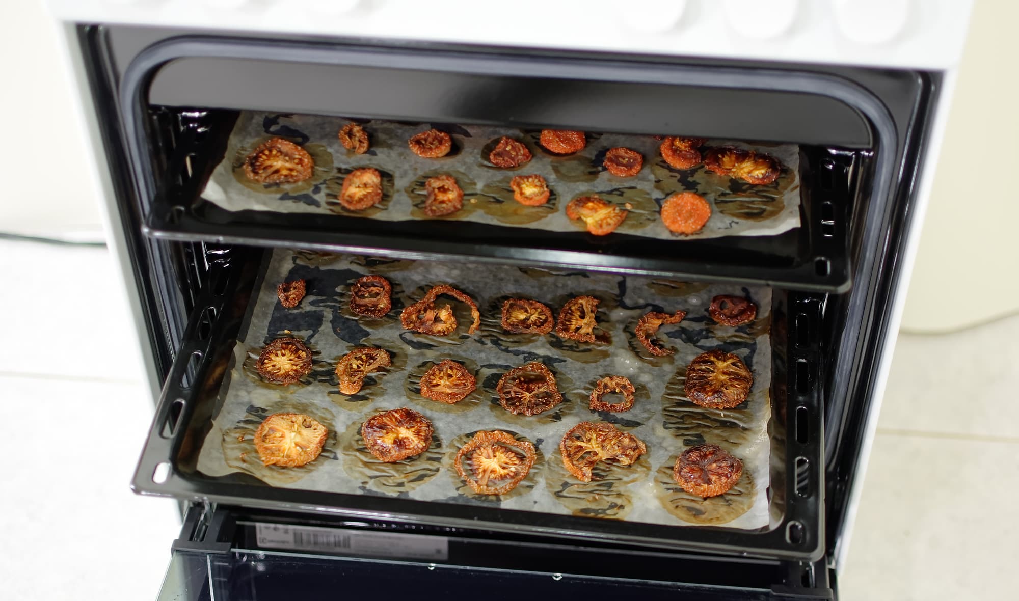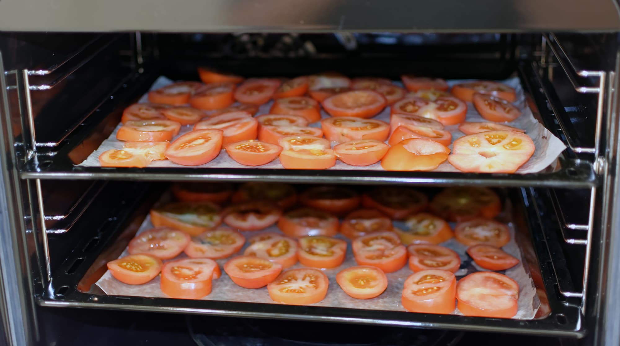 Наличие низкотемпературных режимов позволяет с помощью духовки дегидрировать продукты, то есть вялить и сушить. Дачные овощи, фрукты, ягоды, грибы и травы — все это можно сушить. Потренируемся для примера на помидорах.