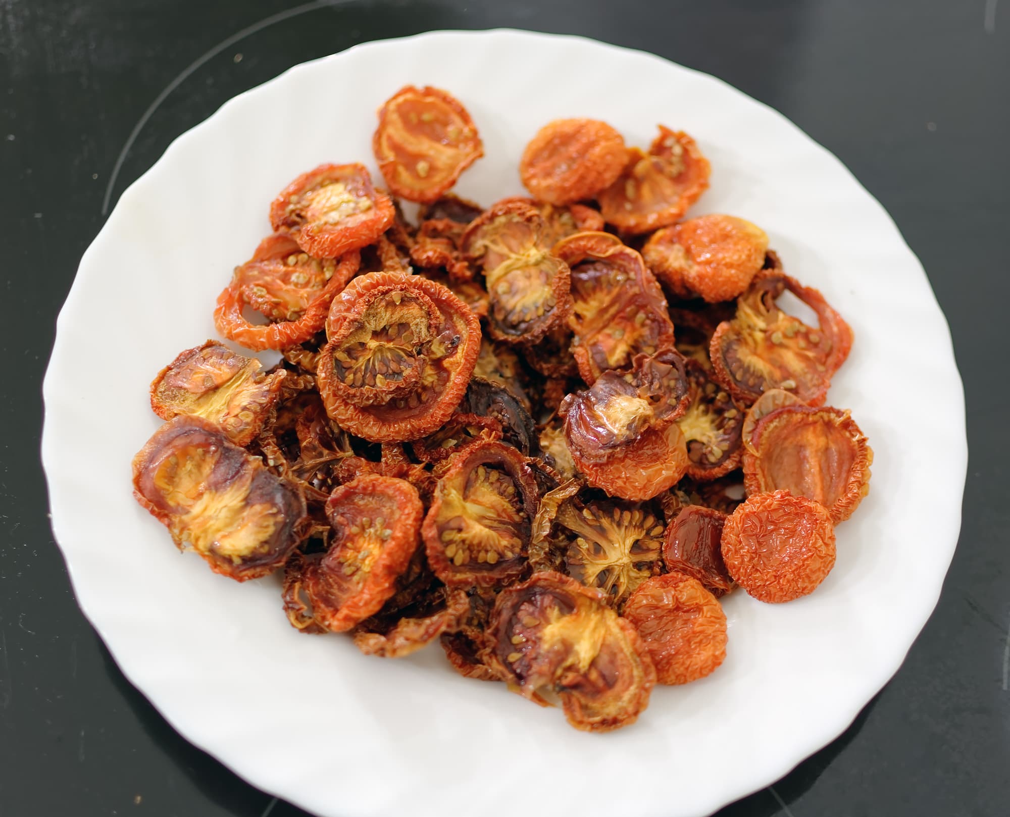 Через 12 часов получили результат. Такие помидоры можно просто съесть или использовать для горячих блюд, а можно плотно набить в банку, добавить чеснока и любимых трав, залить горячим маслом и настоять несколько месяцев — получится деликатес мирового уровня.