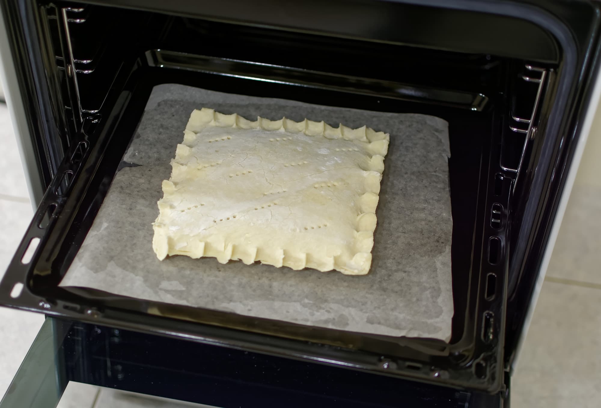 Сформировали будущий пирог, ничем не смазывая, налили на дно духовки сто граммов воды и включили духовку на 180 градусов с функцией пара.
