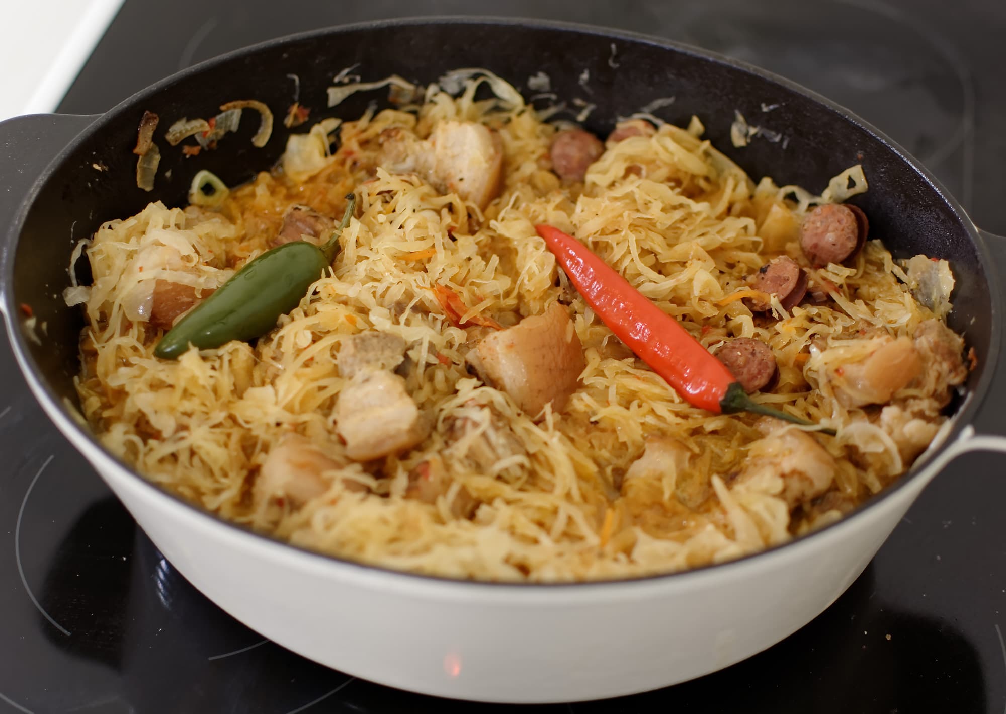 Знатоки и любители польской классической кухни готовят бигос в течение трех суток, по гораздо более сложному, чем наш, рецепту. Общепит штампует бигосы по более простому, чем у нас, рецепту. Мы же выбрали рецепт, который нам просто нравится и который поможет исследовать возможности работы нашей варочной поверхности с посудой с овальным дном.