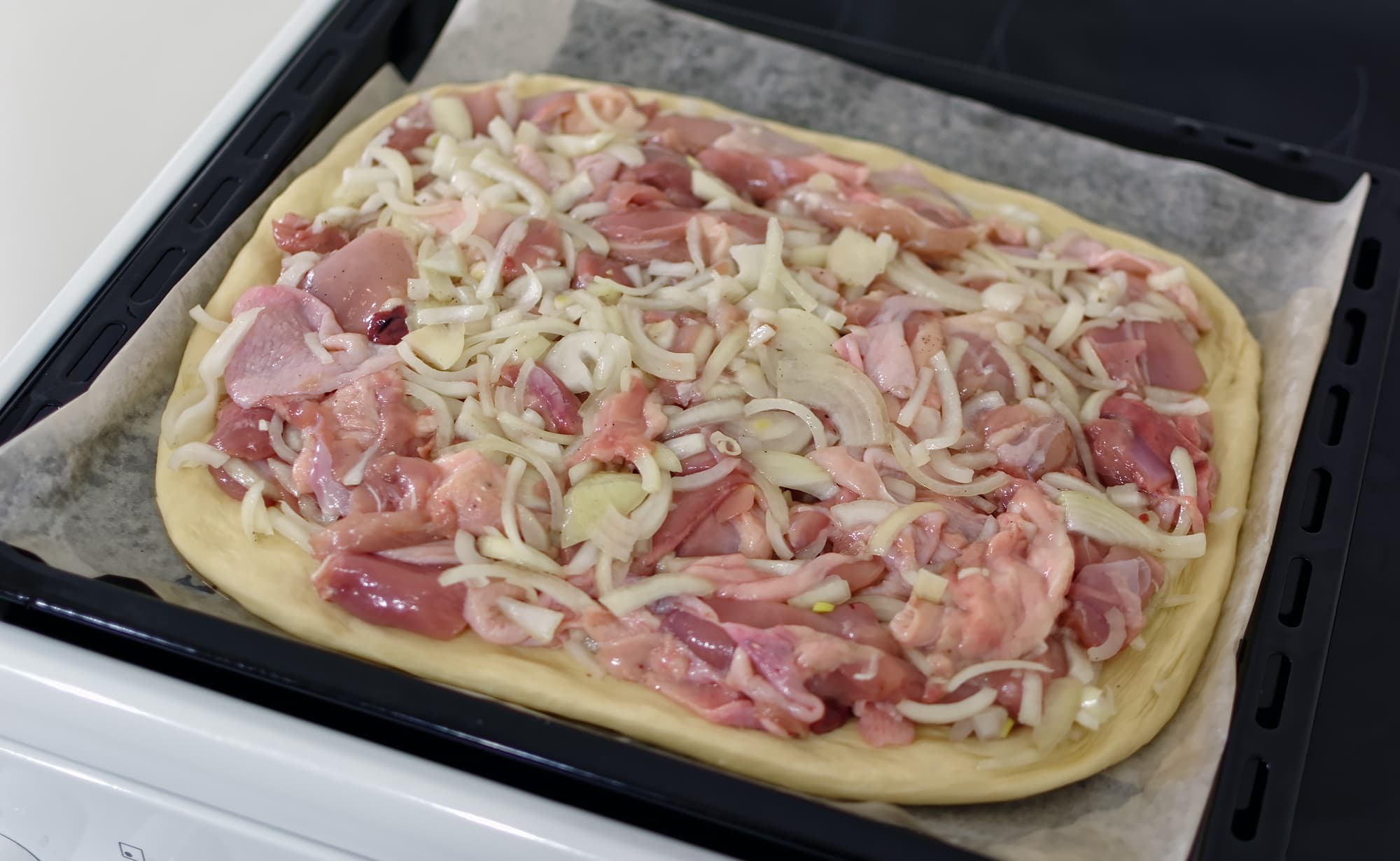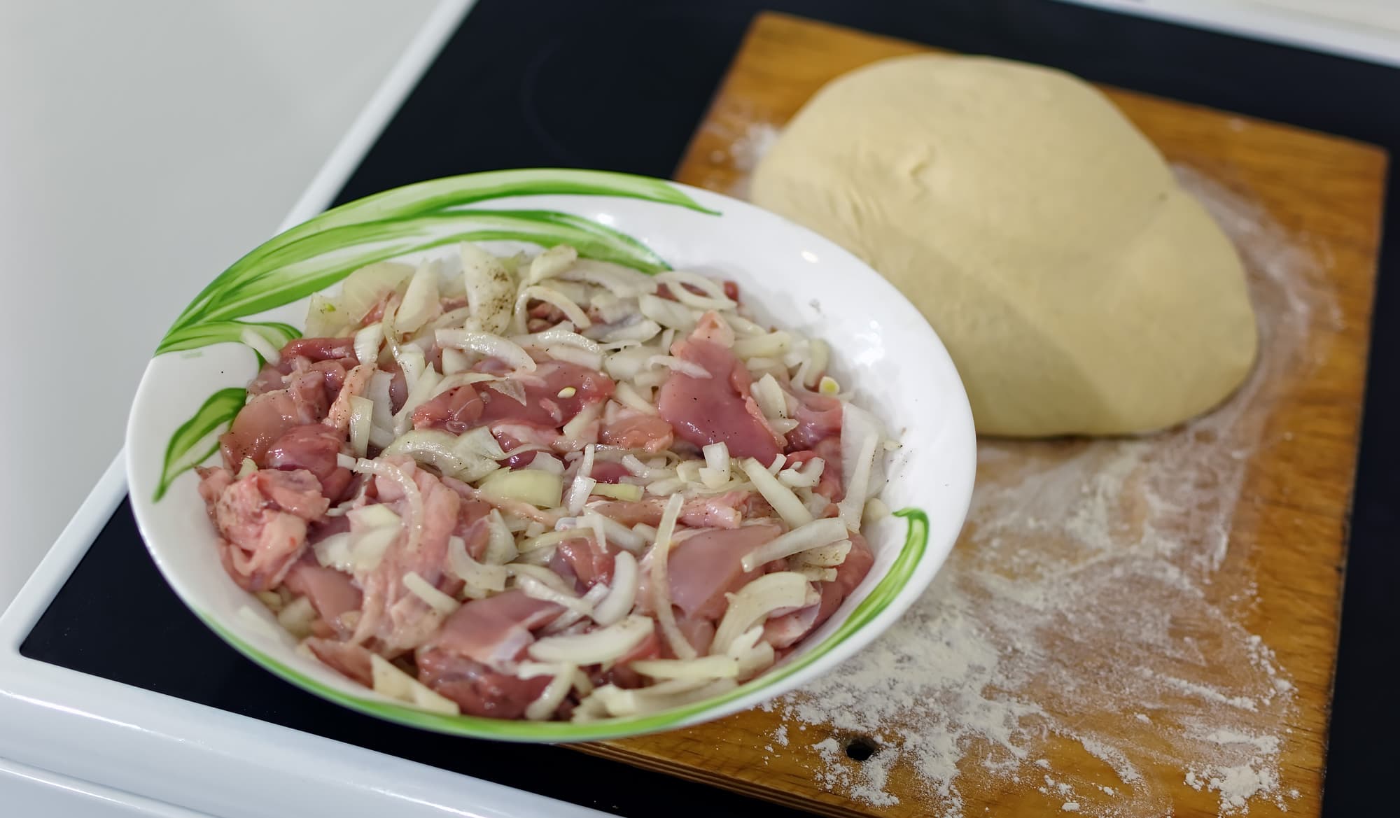На этот раз мы сами сделали обычное дрожжевое тесто (1 кг), а в качестве начинки сняли мякоть с 1,5 кг куриных бедрышек (вместе со шкуркой), нарезали ее довольно крупными кусками, добавили три средних нарезанных луковицы, посолили и поперчили.