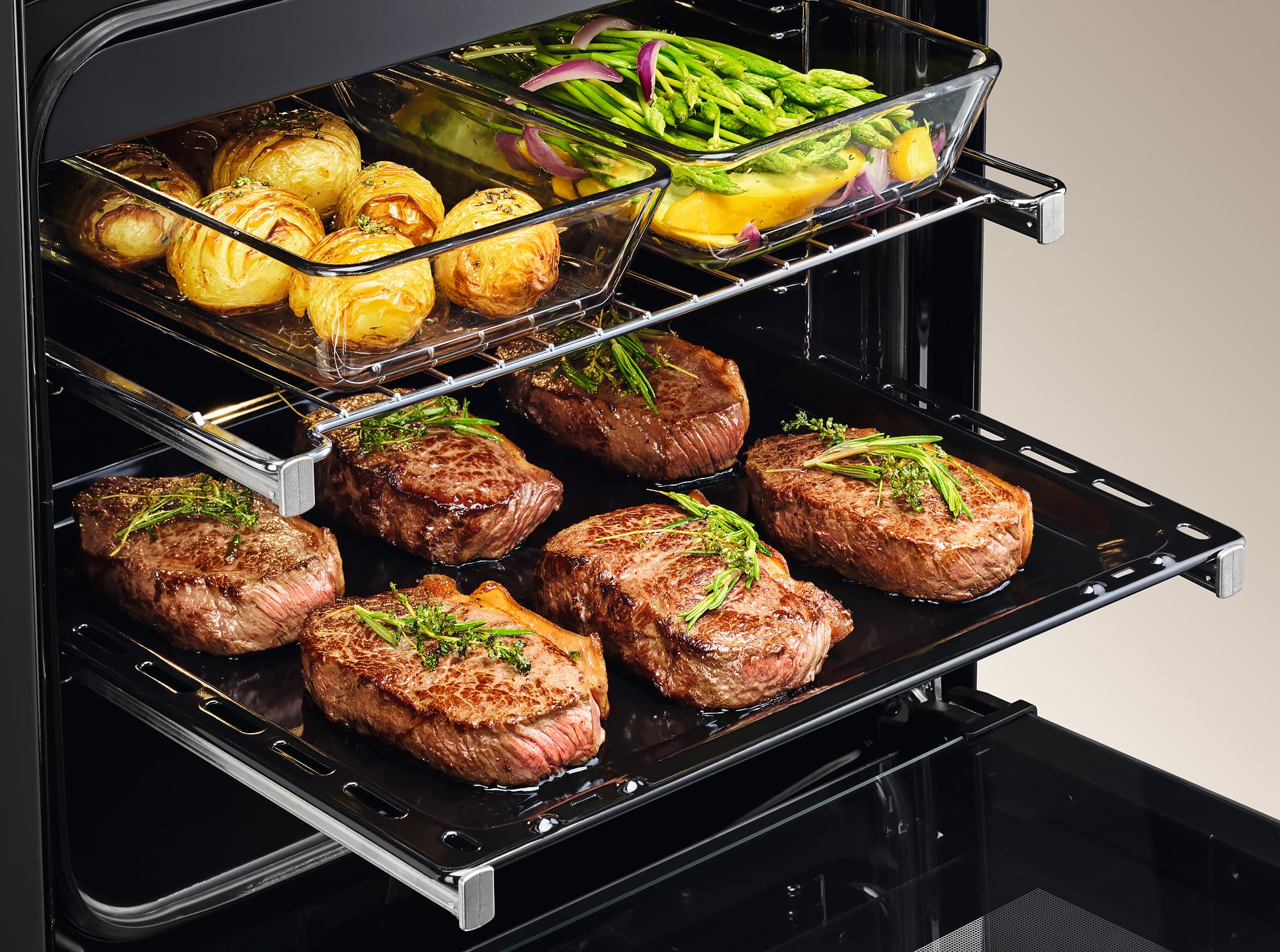 Эксплуатация духовки, пожалуй, еще интереснее. Расположение направляющих и наличие аксессуаров позволяет при желании приготовить на разных уровнях целую гору еды — например, в случае отмечания праздников с большим количеством гостей или когда на даче на выходные съехалось несколько поколений.