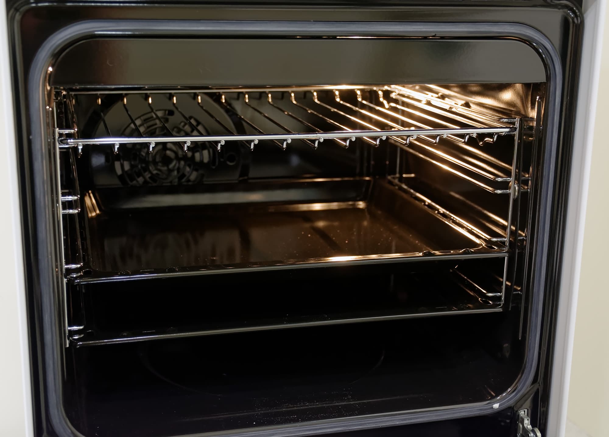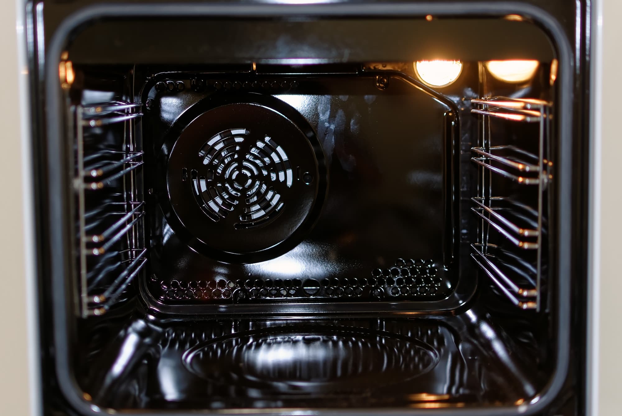 В задней стенке духовки виден вентилятор, который гоняет нагретый воздух, а снизу расположено углубление, куда наливается вода, нужная для образования пара. Под углублением, в которое наливается вода, находится нагревательный элемент, который при нагревании дна, позволяет воде испаряться, образуя пар в духовке в первые 10 минут старта программы с паром. Это очень важно, так как пар необходим для поднятия теста именно в первые 10 минут.
