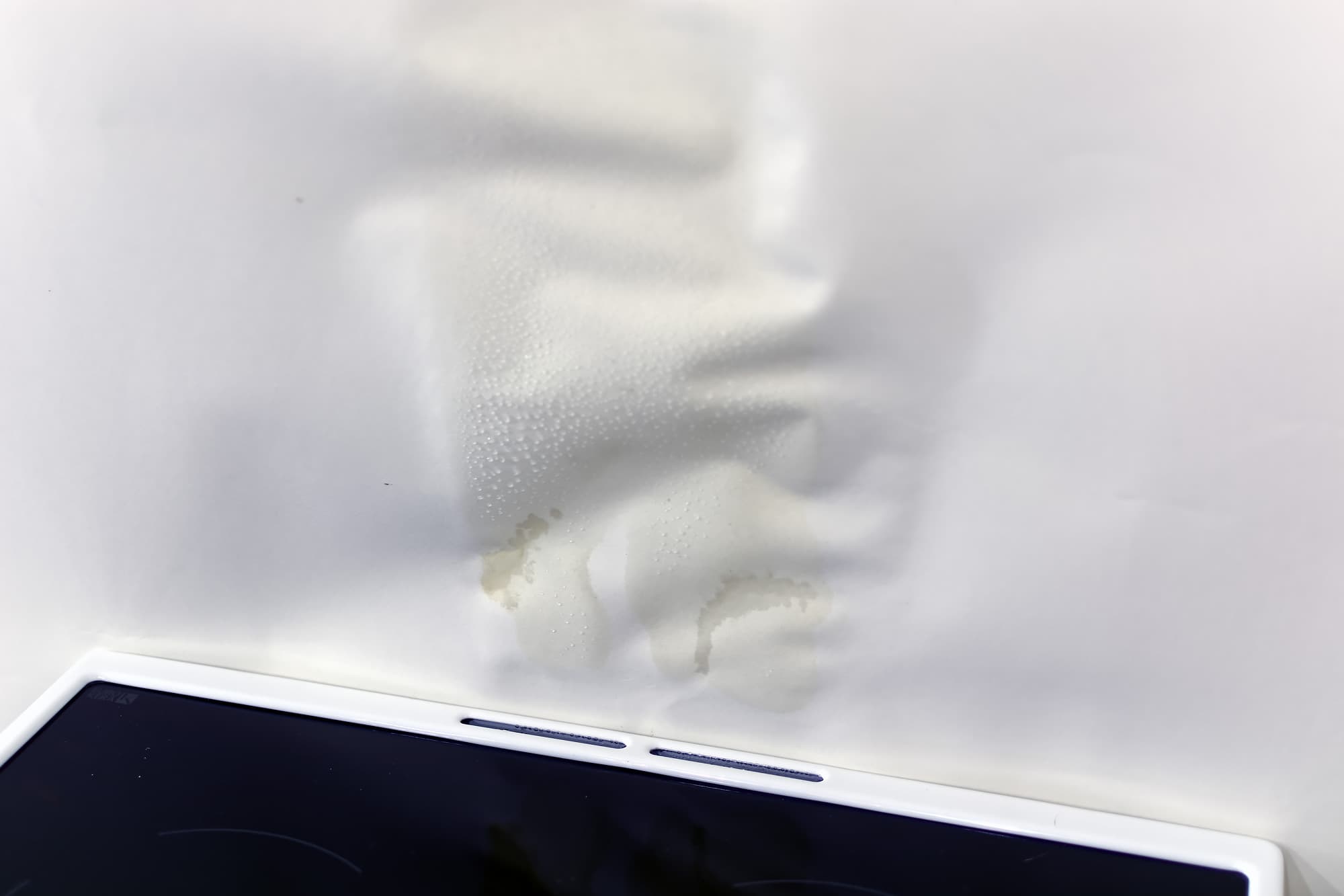 Неочевидная же вещь, на которую стоит обратить внимание — это отверстия для выхода пара. При готовке с использованием функции PlusSteam пар выходит довольно активно, что стоит учитывать при установке плиты. На фото ниже хорошо видно, как деформировалась от пара бумага после первого дня работы. Вряд ли, конечно, у вас на кухне в качестве отделочного материала в зоне готовки используется бумага, но не предупредить об активности паровой струи с нашей стороны было бы нечестно :)