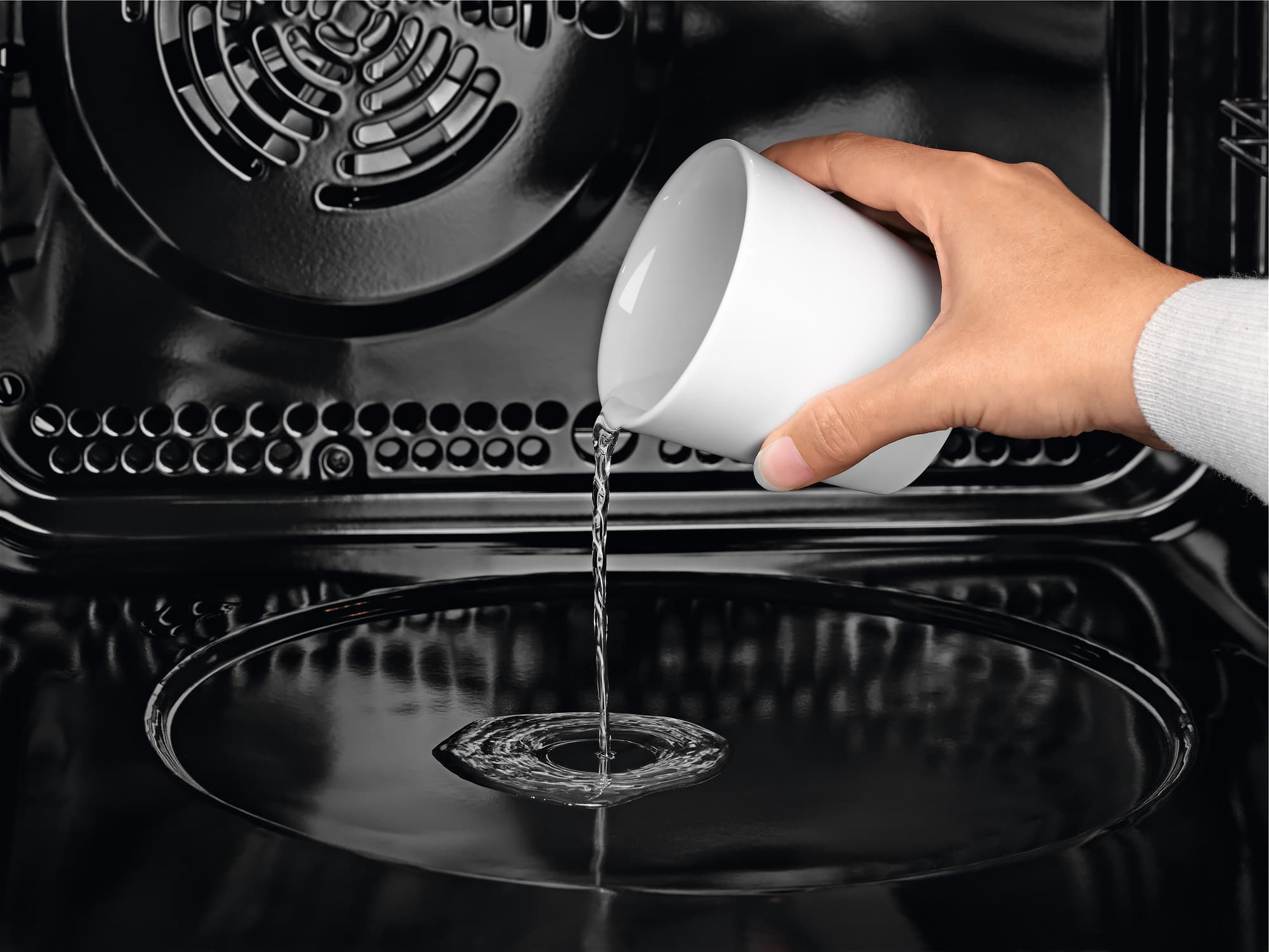 Камеру духового шкафа рекомендуют очищать после каждого использования, используя мягкую влажную ткань снаружи и специальные средства для духовок изнутри. Если на поверхности дна образуется известковый налет от испарившейся воды, можно налить в углубление уксуса, подождать, пока растворится налет, и вытереть уксус.