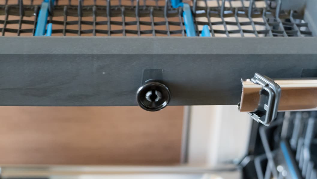 Когда корзина прижата к стенке, разбрызгиватель подсоединяется к разъему для подачи воды на задней стенке посудомойки.