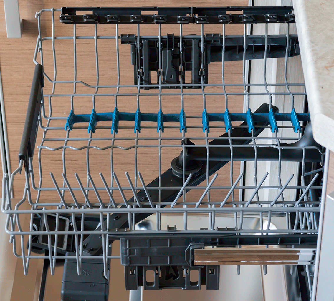 Как мы говорили, эта полка может быть приподнята полностью или с одного бока. Эта возможность особенно ценна при необходимости вымыть что-то крупногабаритное в нижней корзине. Важный момент — система FlexiLift дает возможность изменять корзину даже при полной загрузке, то есть, если внизу образовалось что-то высокое в последний момент, то и перед самым запуском запросто можно изменить положение «верха».