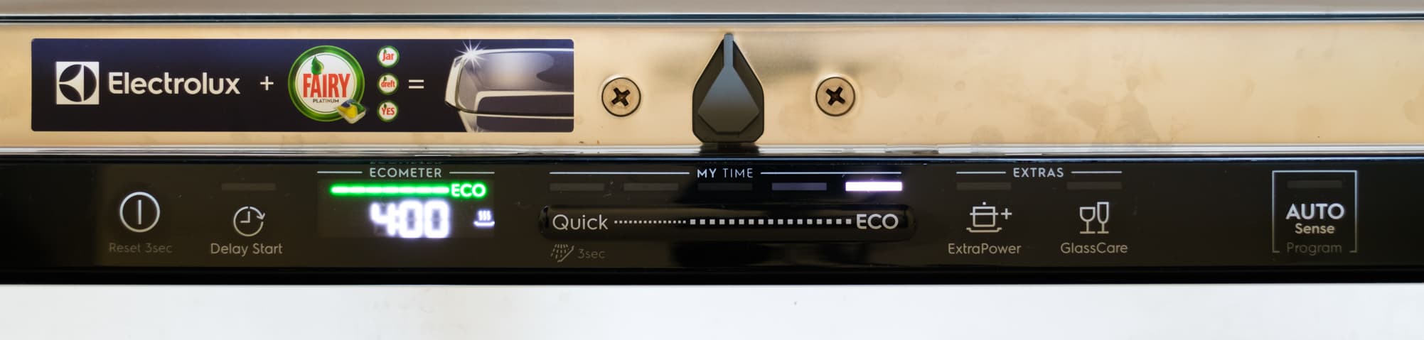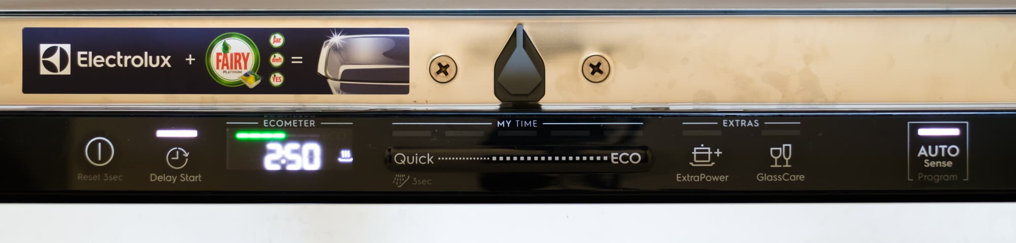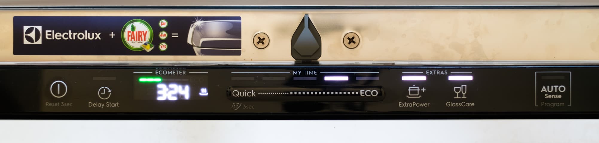 Панель управления расположена на верхнем торце дверцы и визуально поделена на три отрезка, по сторонам от которых находятся «главные» управляющие сенсорные кнопки — включение/отключение, отсрочка старта и программа Auto Sense. Три отрезка — это дисплей с надписью Ecometer, линейка выбора программ My Time и линейка выбора Extras. Рассмотрим каждый из элементов.