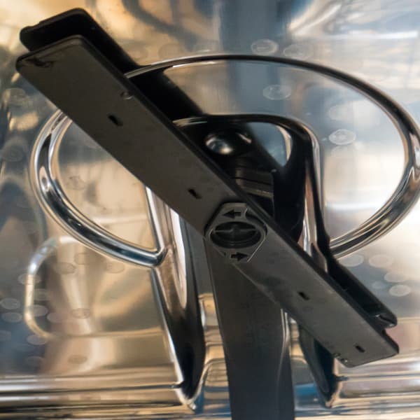 Обращает на себя внимание нижний омыватель, который реализует технологию SatelliteClean — разбрызгивание с двойным вращением. Также на дне прибора размещены емкость для соли и съемные фильтры. В нижней части левой стенки можно увидеть вентиляционное отверстие.