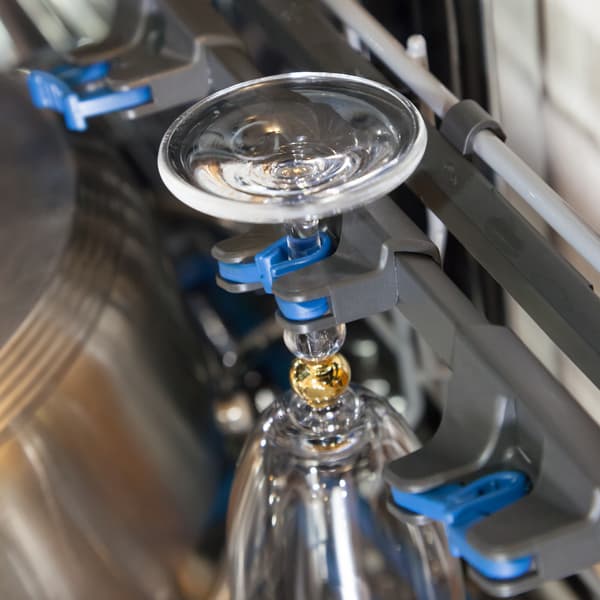 Нижняя корзина примечательна складывающимися фиксаторами с правой стороны и имеющимися там же специальными креплениями для размещения хрупких высоких бокалов с длинными ножками. Держатель для бокалов называется GlassHolder. В него поместится до четырех бокалов, при этом каждый отдельный держатель может сдвигаться по направляющей. Все приспособление целиком может быть поднято вверх и тогда не будет служить помехой для размещения высокой посуды.