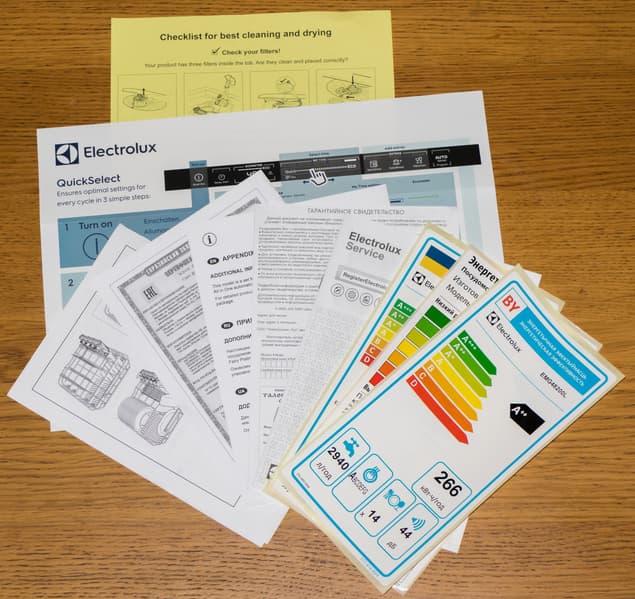 - дополнительные бумажные материалы: наклейки об энергетической эффективности, чек-лист для повышения качества мытья и сушки, сертификат соответствия, примеры загрузки корзин, другие информационные материалы и аксессуары для установки (прокладки и уголки)