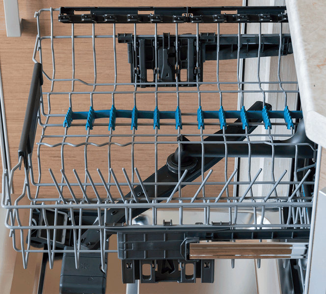 Любопытна и организация первого ряда держателей для тарелок: с левой стороны расстояние между держателями узкое, с правой — более широкое, что позволит разместить глубокие тарелки или объемные блюда. Нижняя корзина может быть полностью выдвинута или вообще вытащена из посудомоечной машины.