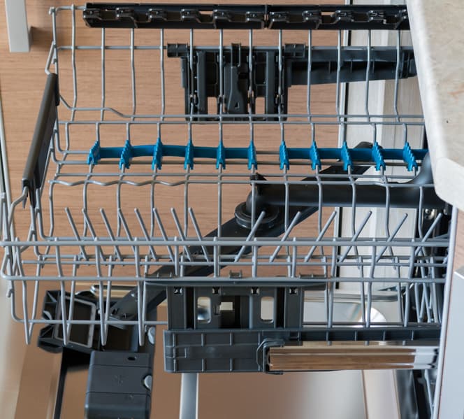 Выдвигается корзина, также как и верхний лоток, полностью. Снизу корзина, точнее размещенная в ней посуда, будет омываться разбрызгивателем лопастного типа.