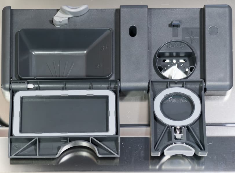 С внутренней стороны дверцы традиционно находятся два отсека: для заливки ополаскивателя и закладки моющего средства. Открываются и закрываются они стандартным образом. На стенке отсека для таблетки нанесены отметки объема моющего средства. Селектор количества выдаваемого ополаскивателя можно регулировать от 1 (минимальная подача) до 4 (максимальное количество ополаскивателя). Необычно направление увеличения дозировки — справа (1) налево (4). Впрочем, при регулировке подачи помогут сориентироваться имеющиеся цифры.