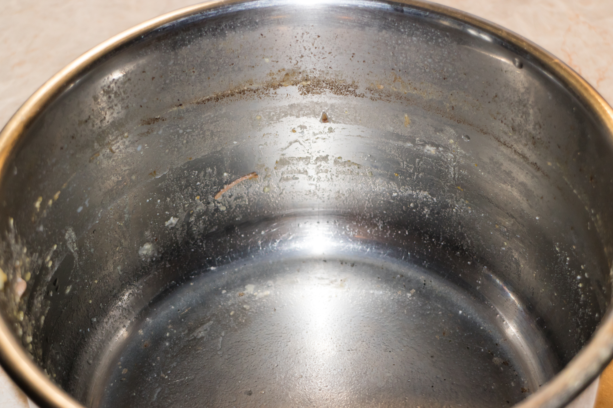 Данный тест также делался конкретно для проверки способностей посудомоечной машины. Для него мы варили куриный бульон при среднем кипении и открытой крышке около полутора-двух часов для того, чтобы часть воды испарилась, и на стенках кастрюли осела и засохла накипь.