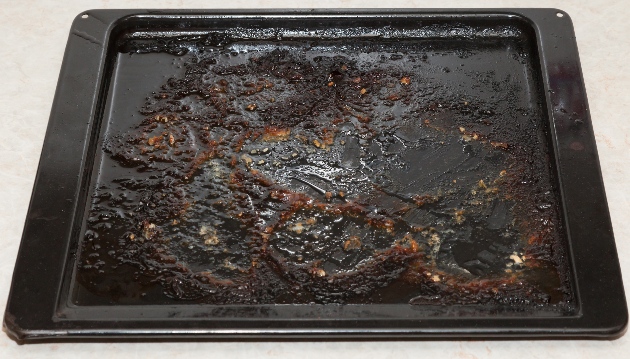 В заключение представим результаты самого сложного, на наш взгляд теста — отмыванию жирного противня после запекания куриных окороков. Перед размещением удалили с поверхности противня лишь остатки прилипшей кожи. Все остальное — жир, засохший сок и маринад оставили как есть.