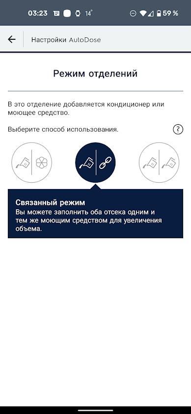 Настройки AutoDose позволяют использовать лотки устройства в конфигурации «гель+кондиционер» (по умолчанию), залить в обе емкости одно и то же моющее средство для увеличения объема или использовать две разных жидкости, выбирая нужную перед каждой стиркой.