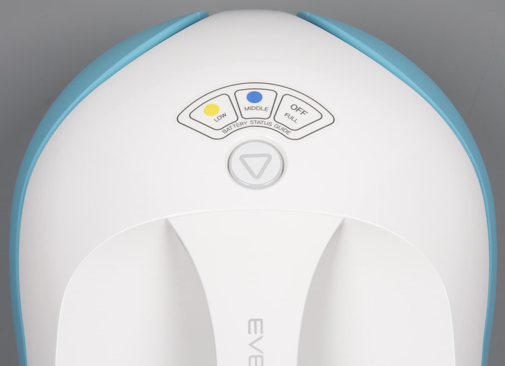 Кнопка изготовлена из молочно-белого полупрозрачного пластика. Снизу она подсвечивается зеленым или синим, что помогает определить состояние робота. Наклейка рядом разъясняет индикацию уровня заряда. Во время зарядки кнопка мигает раз в две секунды зеленым при низком уровне, также часто синим при среднем уровне и не подсвечивается после окончания зарядки. Это очень неудобный способ индикации, так как нужно долго смотреть на робота, чтобы определить его состояние, и окончание зарядки никак не отличить от состояния, когда по какой-то причине внешнее питание не подается. При нормальной работе кнопка подсвечивается синим, непосредственно перед окончанием работы из-за разряда аккумулятора и при ошибке кнопка мигает зеленым, и некоторое время после автоматического завершения уборки кнопка горит зеленым. Дополнительно о некоторых изменения в состоянии робот информирует с помощью негромких звуковых сигналов (запуск и остановка уборки, окончание зарядки, ошибка). Сверху сзади есть оптический датчик, состоящий из ИК-диода и ИК-приемника.