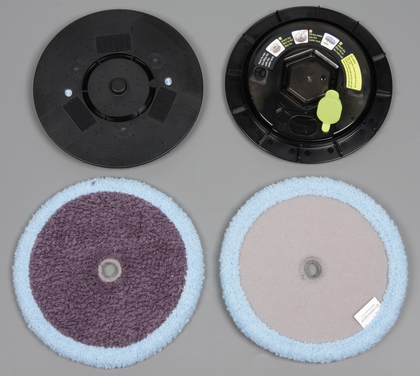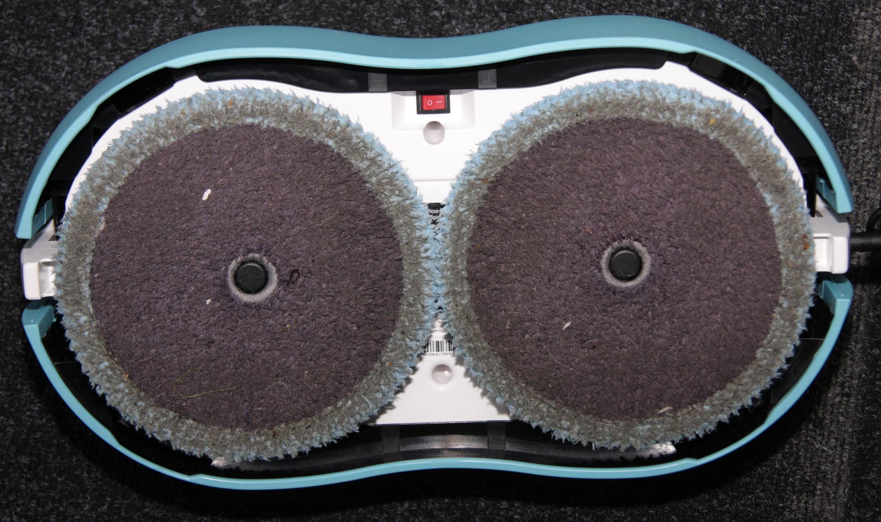 Обратим внимание на то (3:37 на видео), как робот объезжает черный коврик, видимо, ориентируясь на датчики отрыва от пола. Робот никак не ориентируется в пространстве и не строит карту, его перемещение имеет условно случайный характер. Препятствия робот определяет только при столкновении с ними, поэтому ударяется о них довольно сильно, с громким звуком. Увлажнение пола умеренное, через несколько минут след за роботом уже высыхает (но влажность в помещении скорее была низкой). Поэтому этого робота можно использовать для уборки всех видов гладких полов, включая невлагостойкий ламинат, паркет и дощатые полы. В наших условиях вода в резервуарах заканчивалась примерно на 30-й минуте работы, при этом бо́льшую часть времени влажный след шел двумя полосами с сухим промежутком в центре. От одного заряда аккумулятора робот проработал один раз 48 минут, второй — 66 минут. Учитывая это, имеет смысл сначала запускать робота на 30 минут, останавливать, менять салфетки и доливать воду в резервуар, а затем запускать уже до разряда аккумулятора. В конце одного из циклов уборки салфетки приобрели вот такой вид: