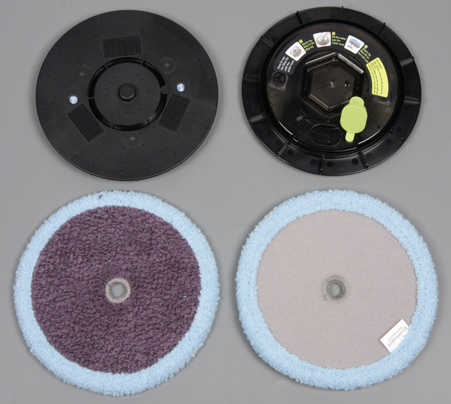 Перед началом уборки салфетки нужно хорошо смочить водой и отжать, а потом закрепить на площадках так, чтобы центральное отверстие в салфетке совместилось с выступом в центре площадки. Для поддержания салфеток во влажном состоянии, в емкости на площадках нужно залить воду, и закрыть заливные отверстия заглушками из упругого пластика. В эти емкости вмещается примерно 60 мл воды. Отметим, что заливать нужно именно чистую воду.