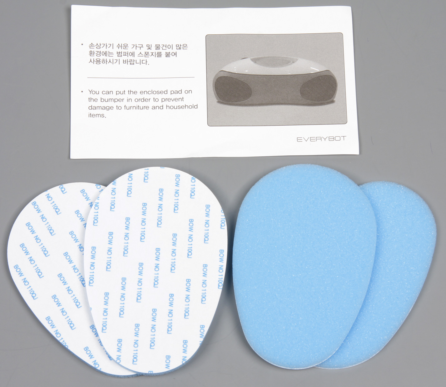 Бамперы изготовлены из жесткого черного пластика, но снаружи они имеют упругое, напоминающее резину, покрытие голубого цвета. Это покрытие предохраняет бамперы и мебель от повреждений при столкновениях. Для дополнительной защиты на бамперы можно наклеить поролоновые накладки с клеевым слоем, входящие в комплект поставки.