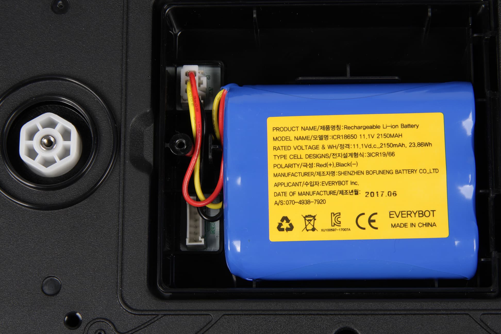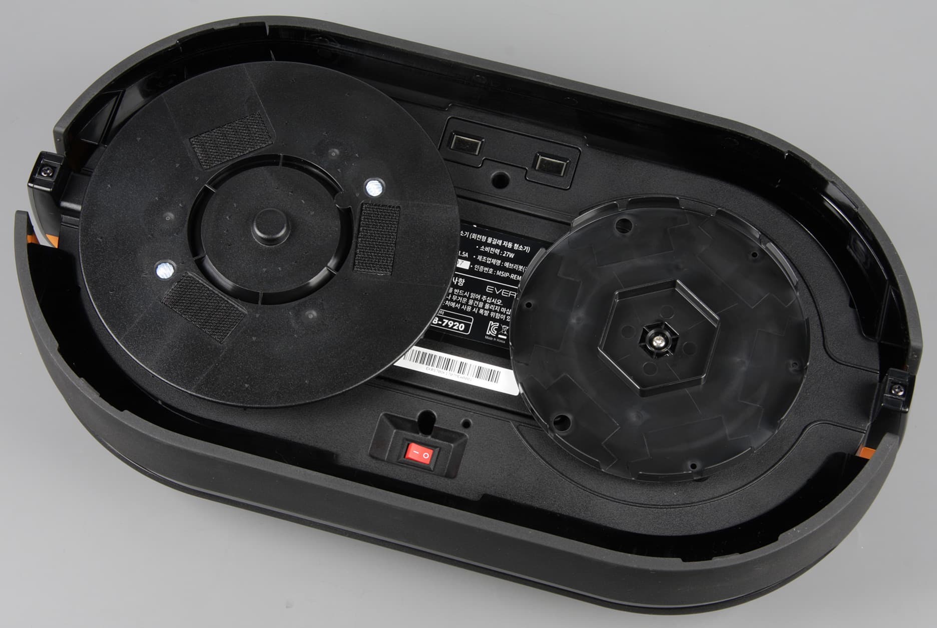 На днище находятся клавиша питания, крышка отсека аккумулятора с наклейкой, контактные площадки для зарядке на базе и два диска. ИК-датчики перепада высоты, благодаря которым робот может избежать падения со ступенек, находятся, по всей видимости, за ребрами бамперов.