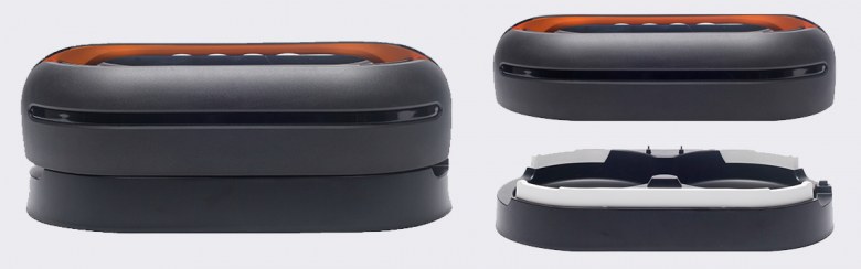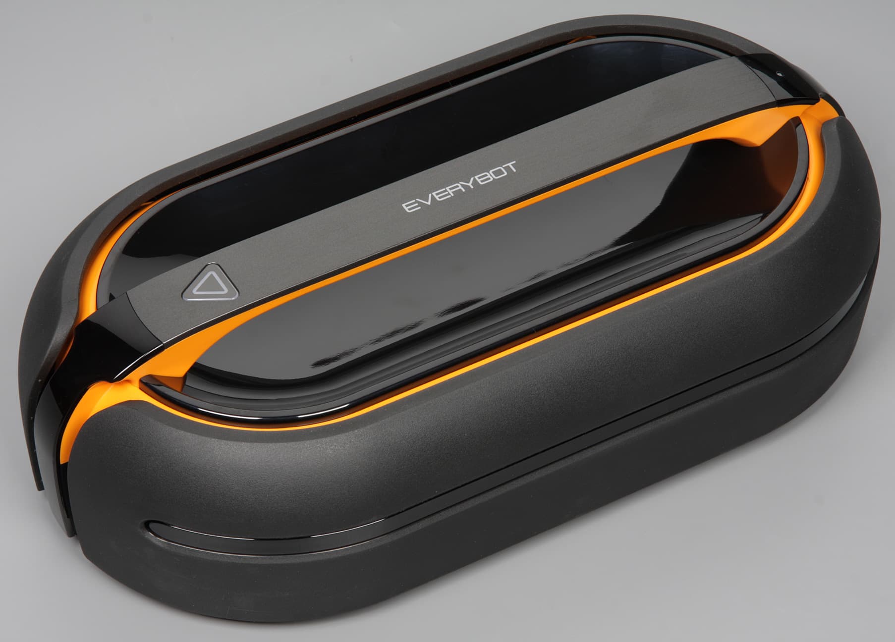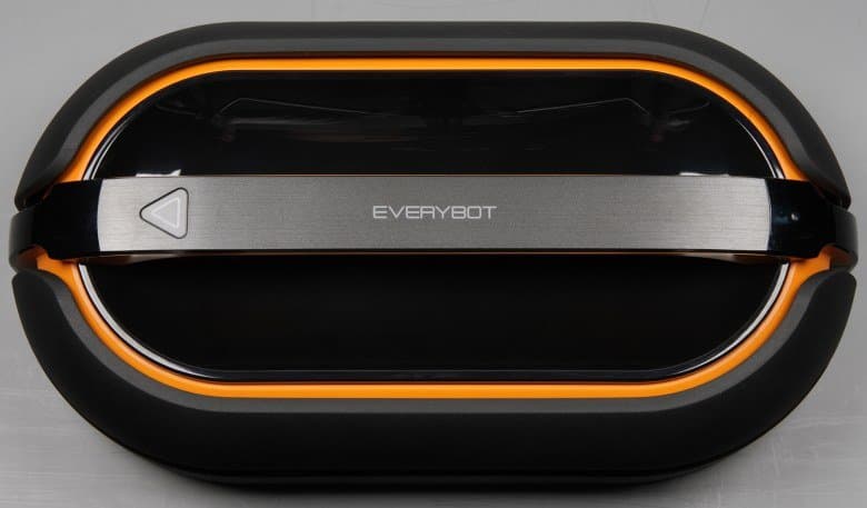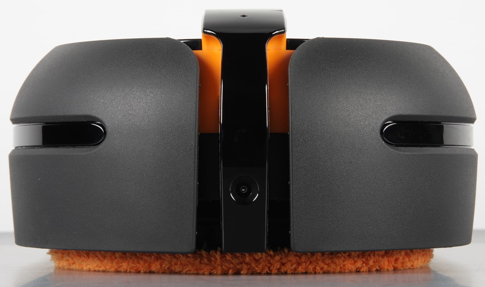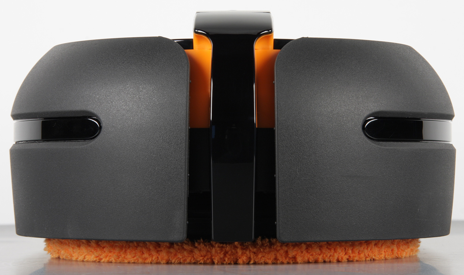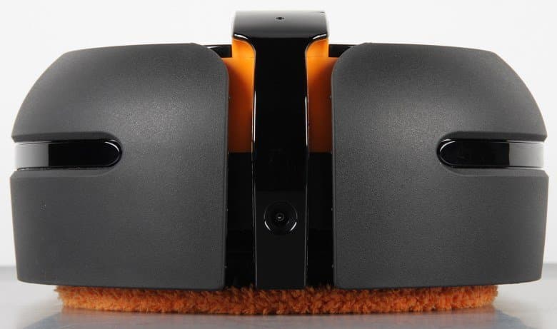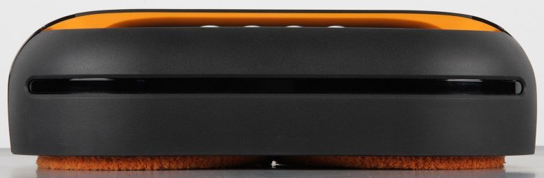 Согласно нашим измерениям, высота в снаряженном состоянии составляет 110 мм, что сравнимо с высотой типичного робота-пылесоса. Длина равна 371 мм, а ширина 203 мм. Габариты робота определяют минимальный просвет от пола предметов обстановки, под которые он может забраться, и доступность для него узких проходов. Весит робот 2152 г без учета залитой воды. Корпус робота в основном изготовлен из черного пластика без покрытия, но есть и радующие глаз элементы из оранжевого пластика также без покрытия. Углубление сверху под ручкой имеет зеркально-гладкую и очень маркую поверхность. Вообще преимущественно темный цвет корпуса — это не очень хорошее решение для перемещающегося по полу робота. Спереди и сзади есть вставки из прозрачного тонированного пластика с зеркально-гладкой поверхностью.
