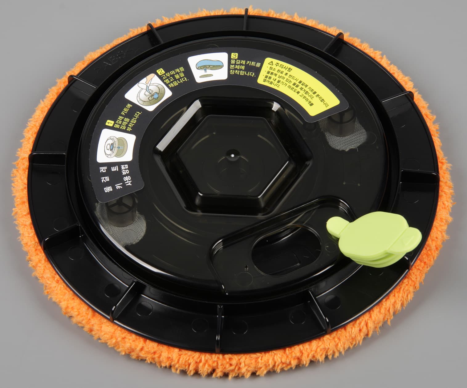 Перед началом уборки салфетки нужно хорошо смочить водой и отжать, а потом закрепить на площадках так, чтобы центральное отверстие в салфетке совместилось с выступом в центре площадки.