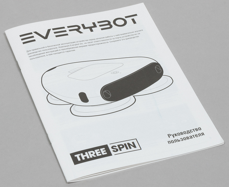 Робот-полотер Everybot Three Spin поставляется в фирменной коробке из гофрированного картона. На лицевой стороне упаковки схематически изображено само устройство, крупным шрифтом напечатан логотип компании, ниже — название модели. На боковых гранях есть наклейки на русском языке с техническими характеристиками прибора и информацией о производителе. Упаковка оснащена пластиковой ручкой для переноски.
