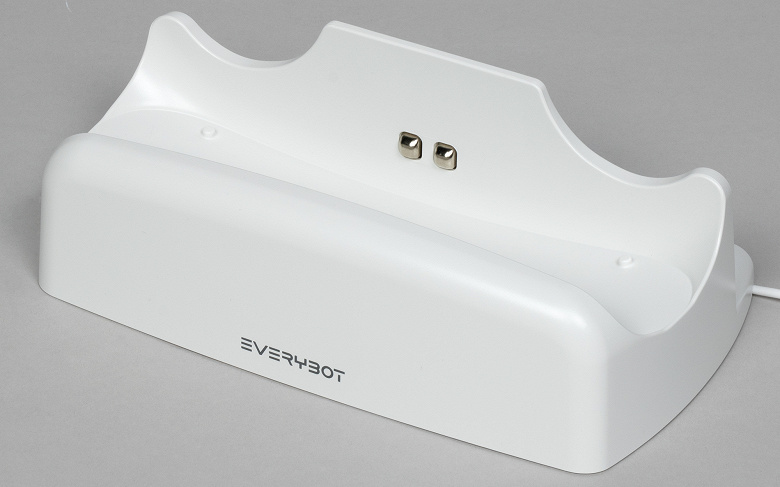 Благодаря четырем прорезиненным ножкам на дне станции конструкция одинаково устойчиво держится на поверхности, как с установленным роботом, так и без него. С обратной стороны помимо ножек находится разъем для подключения шнура блока питания и наклейка с технической информацией.