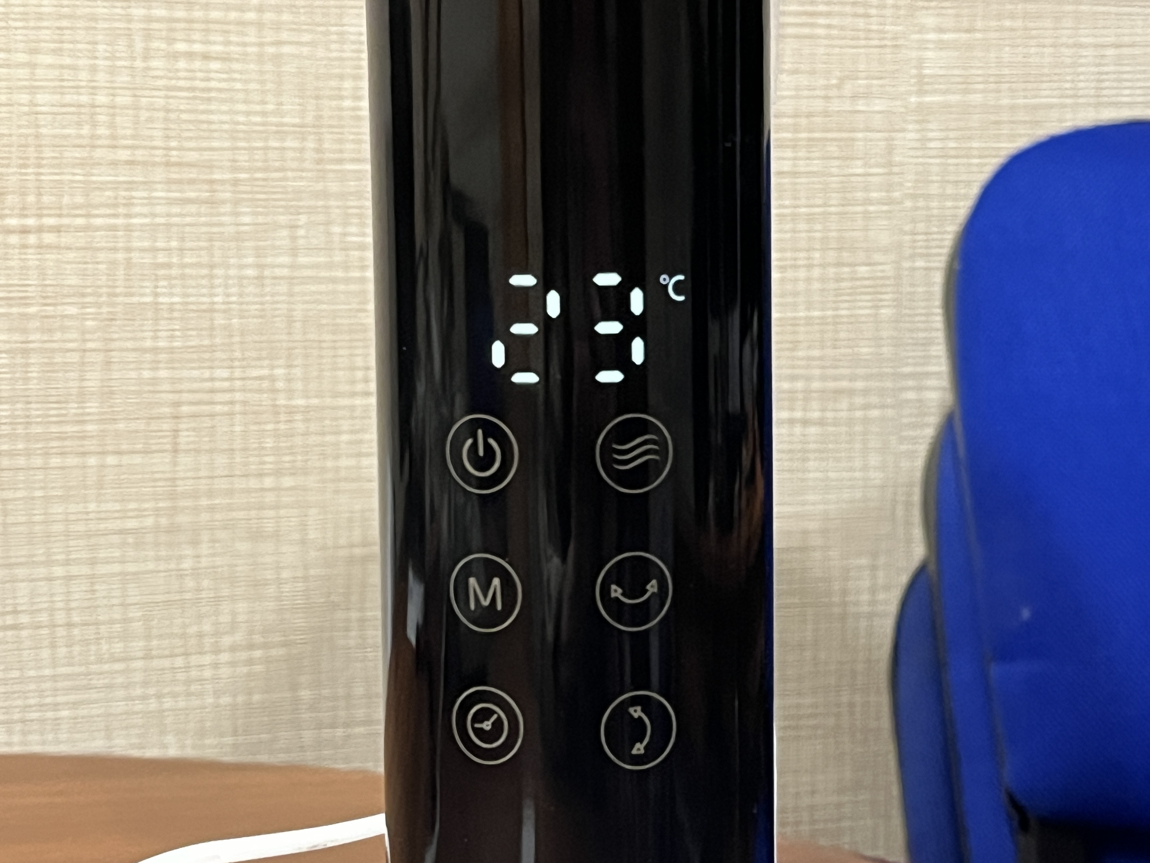 «Автоматический» режим здесь спрятан под кнопкой «AI». При нажатии на эту кнопку, на дисплее загорается индикатор температуры (°C) и заданное по умолчанию значение — 20 градусов. С помощью кнопок «+» и «−» можно установить желаемое значение от 20 до 30 °C. Вентилятор начнет работать мощнее или слабее в зависимости от текущей температуры и будет постоянно регулировать мощность в дальнейшем, пока используется данная функция.