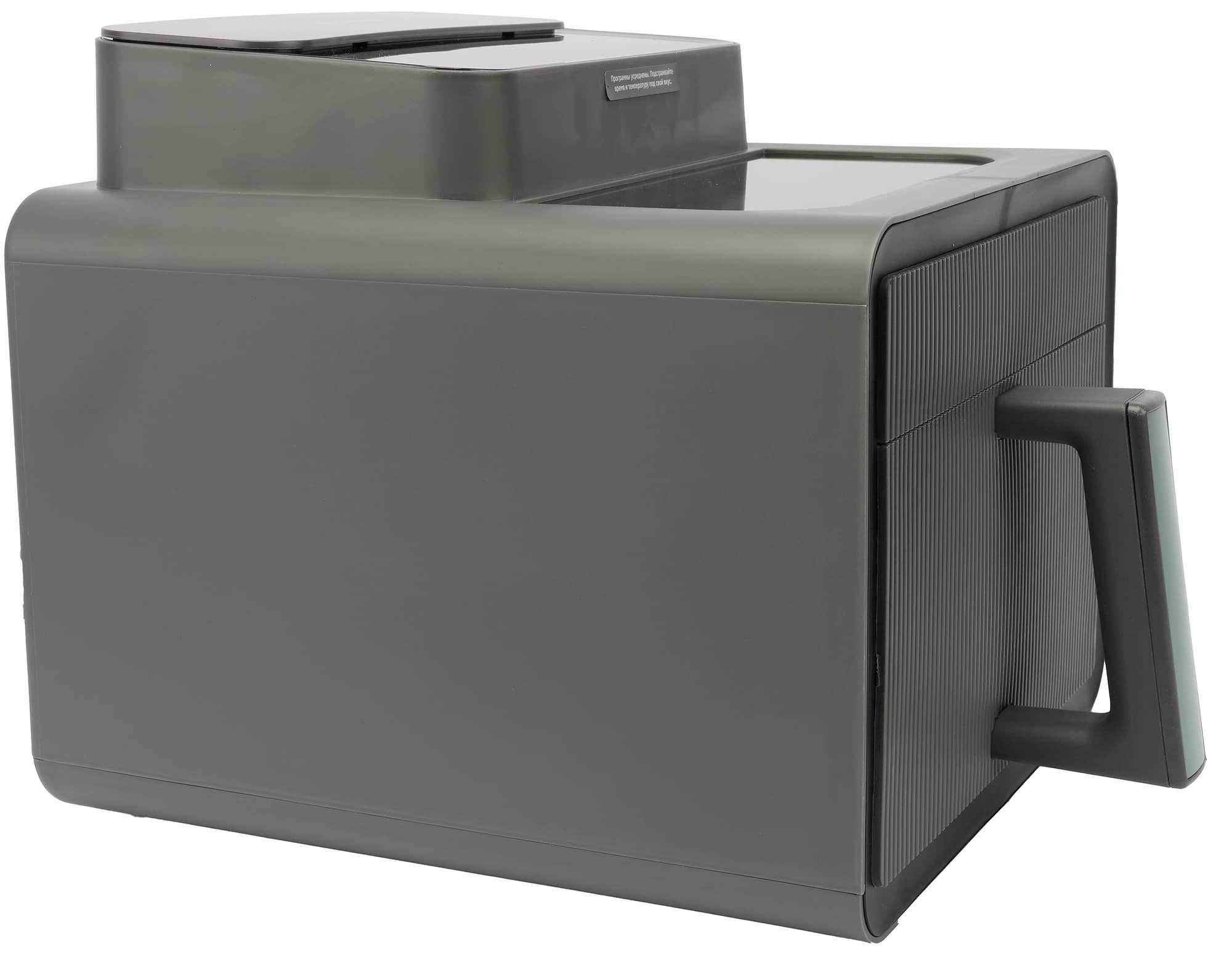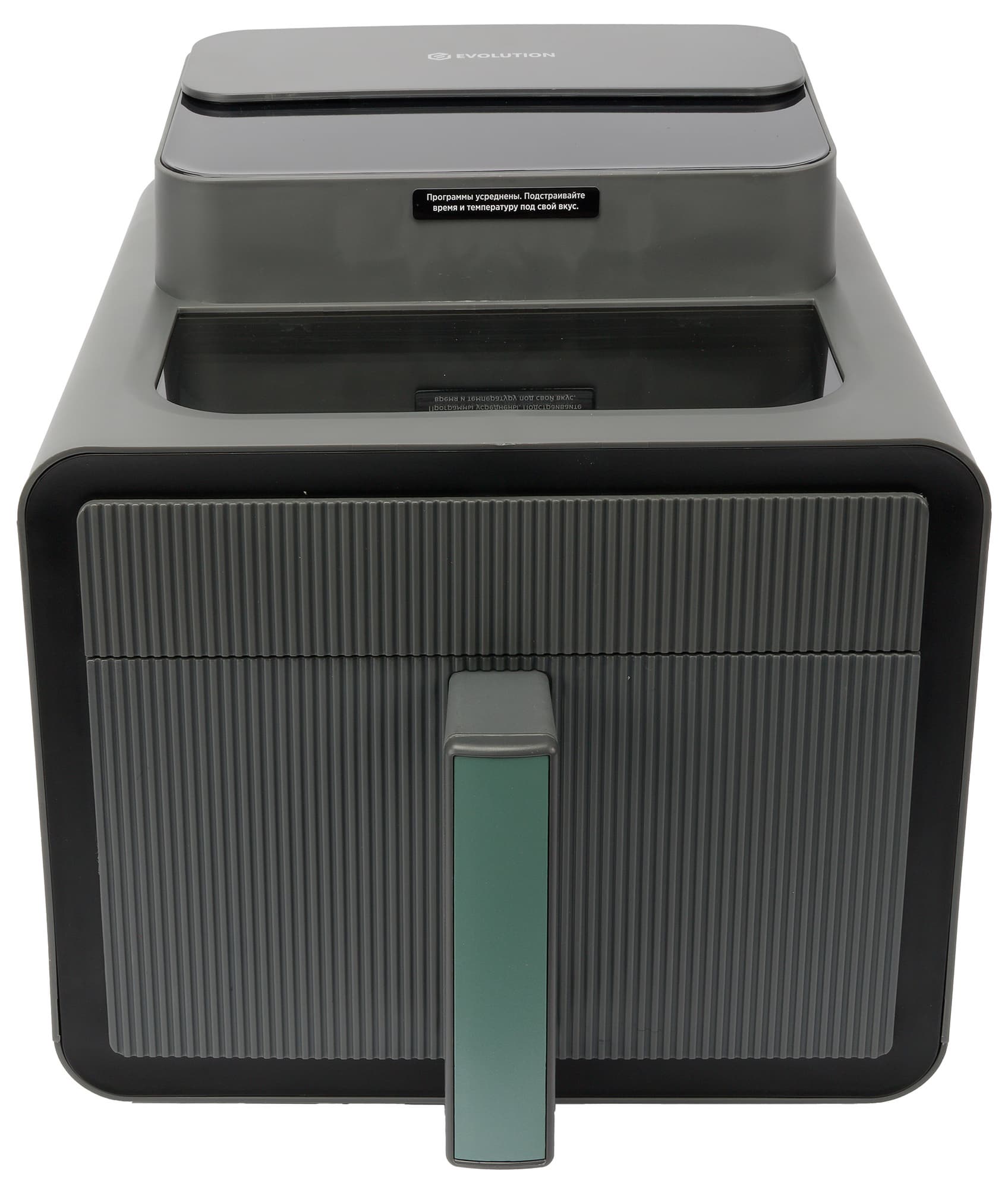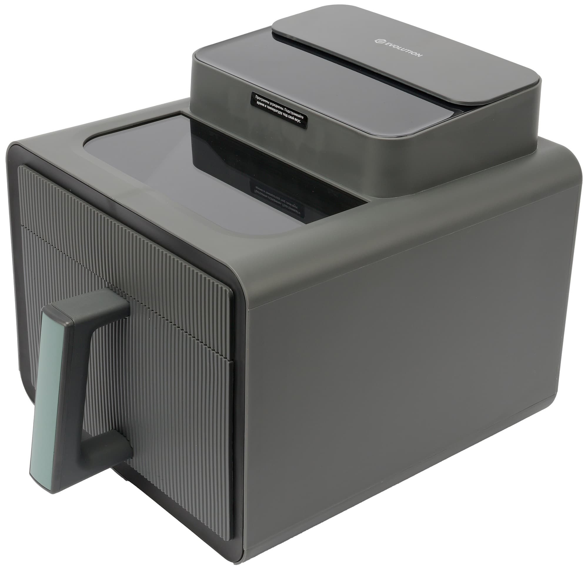 Аэрофритюрница Evolution Airo 7700TW производит приятное первое впечатление благодаря аккуратному и компактному дизайну. Эргономика корпуса продумана хорошо, однако стоит отметить один нюанс: визуальная граница между чашей и основным блоком практически не видна — зазор настолько тонкий, что с первого взгляда их можно принять за монолитную конструкцию.