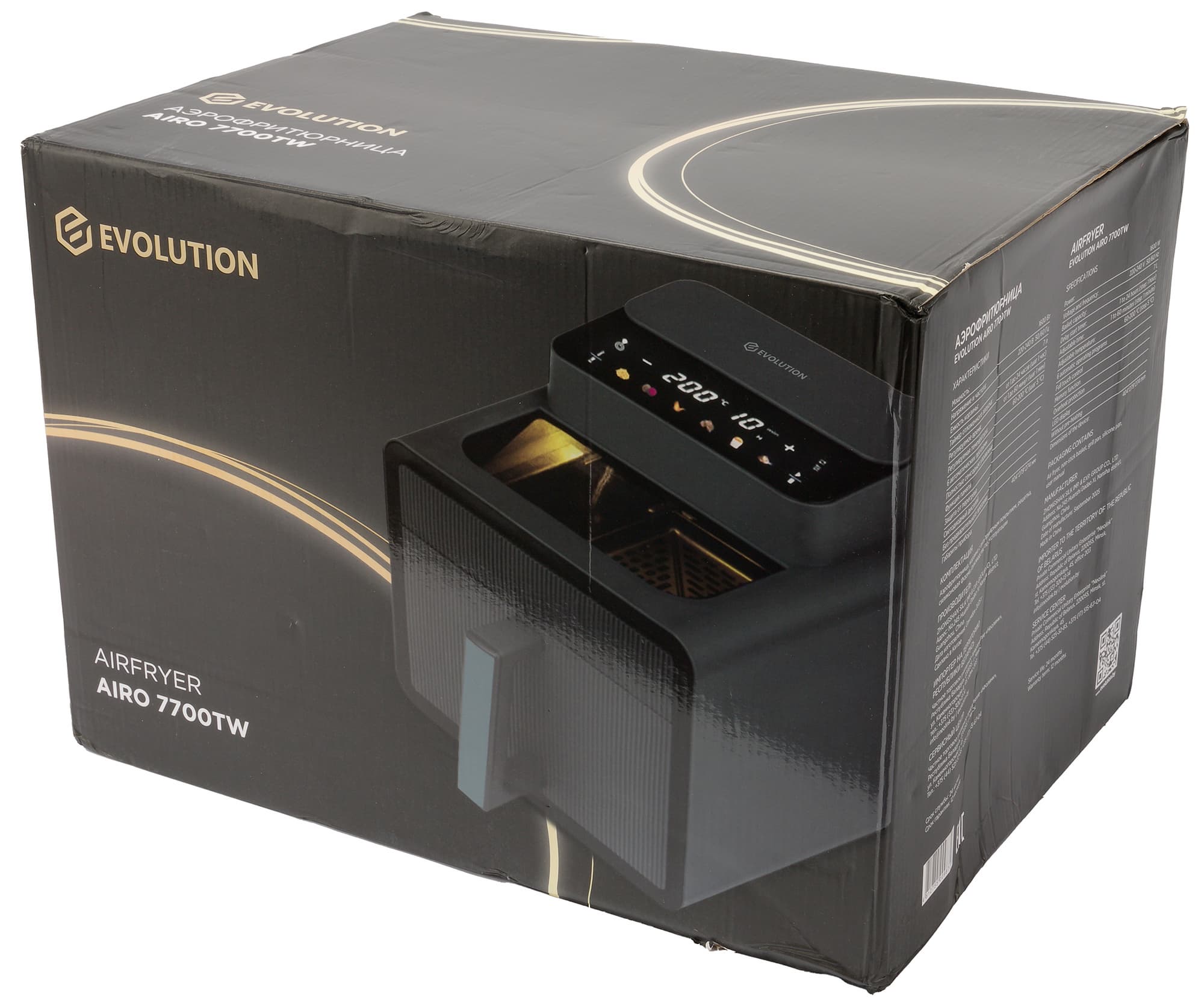 Упаковка Evolution Airo 7700TW выполнена в привычном для бренда дизайне: картонная коробка содержит крупное фото прибора и исчерпывающую информацию о его характеристиках.