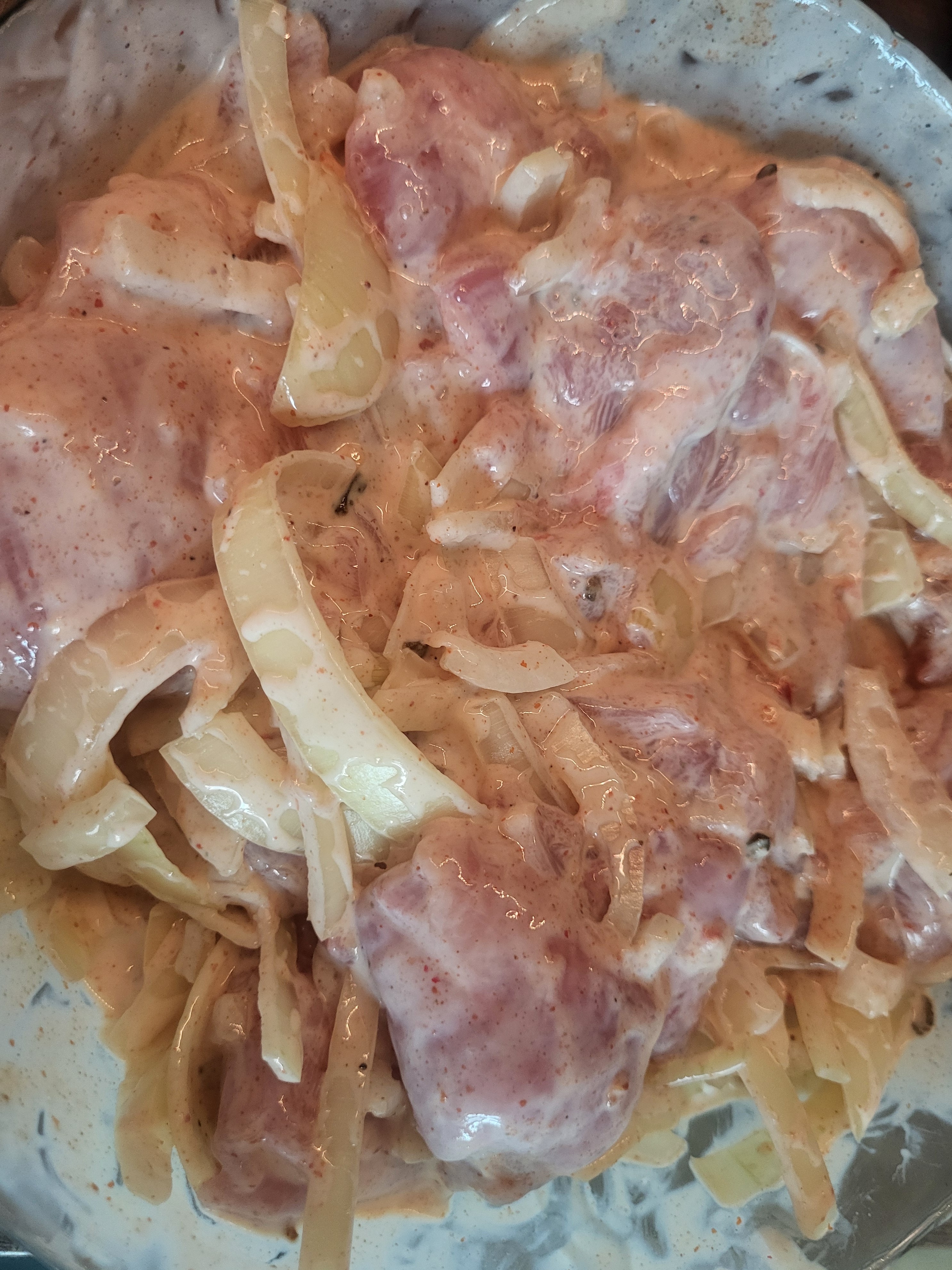 Кефир, соль (1 ст. ложка), перец, паприку, мелко нарезанный чеснок и крупно нарезанный лук смешали с кусочками курицы и убрали в холодильник часа на три.