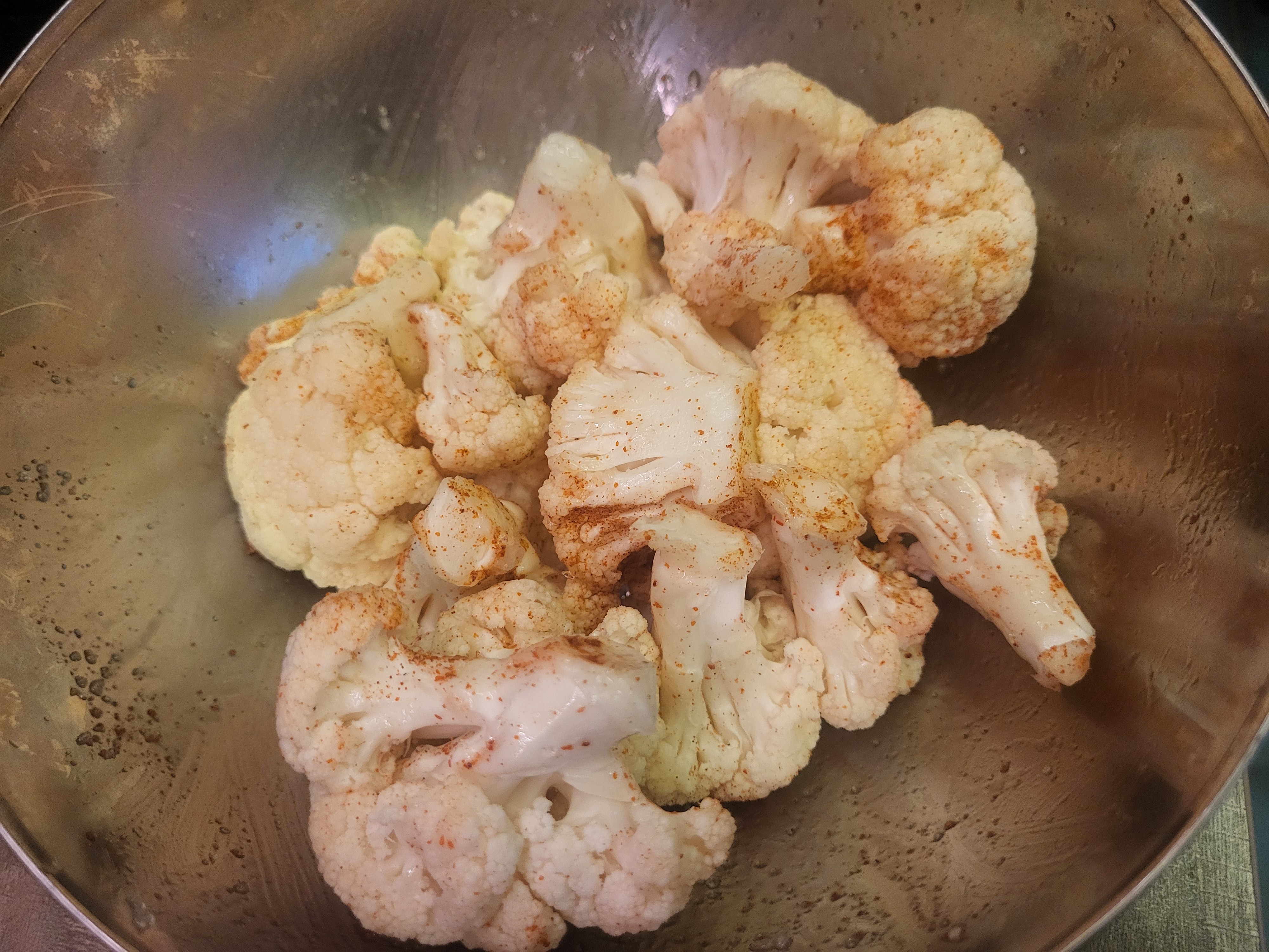 На гарнир к шашлычкам мы решили сделать цветную капусту. Ее тоже предварительно обмазали смесью растительного масла с копченой паприкой и солью.