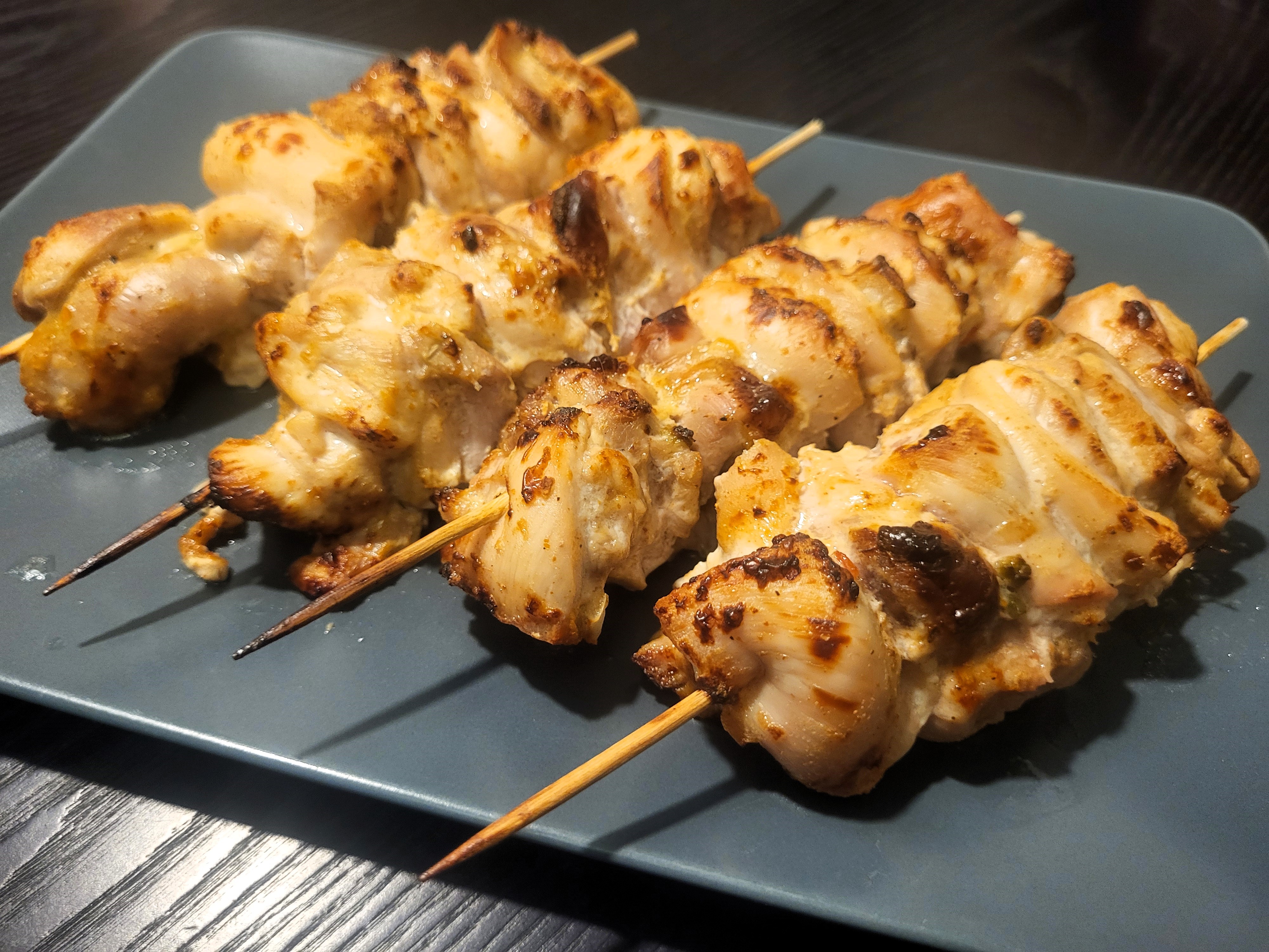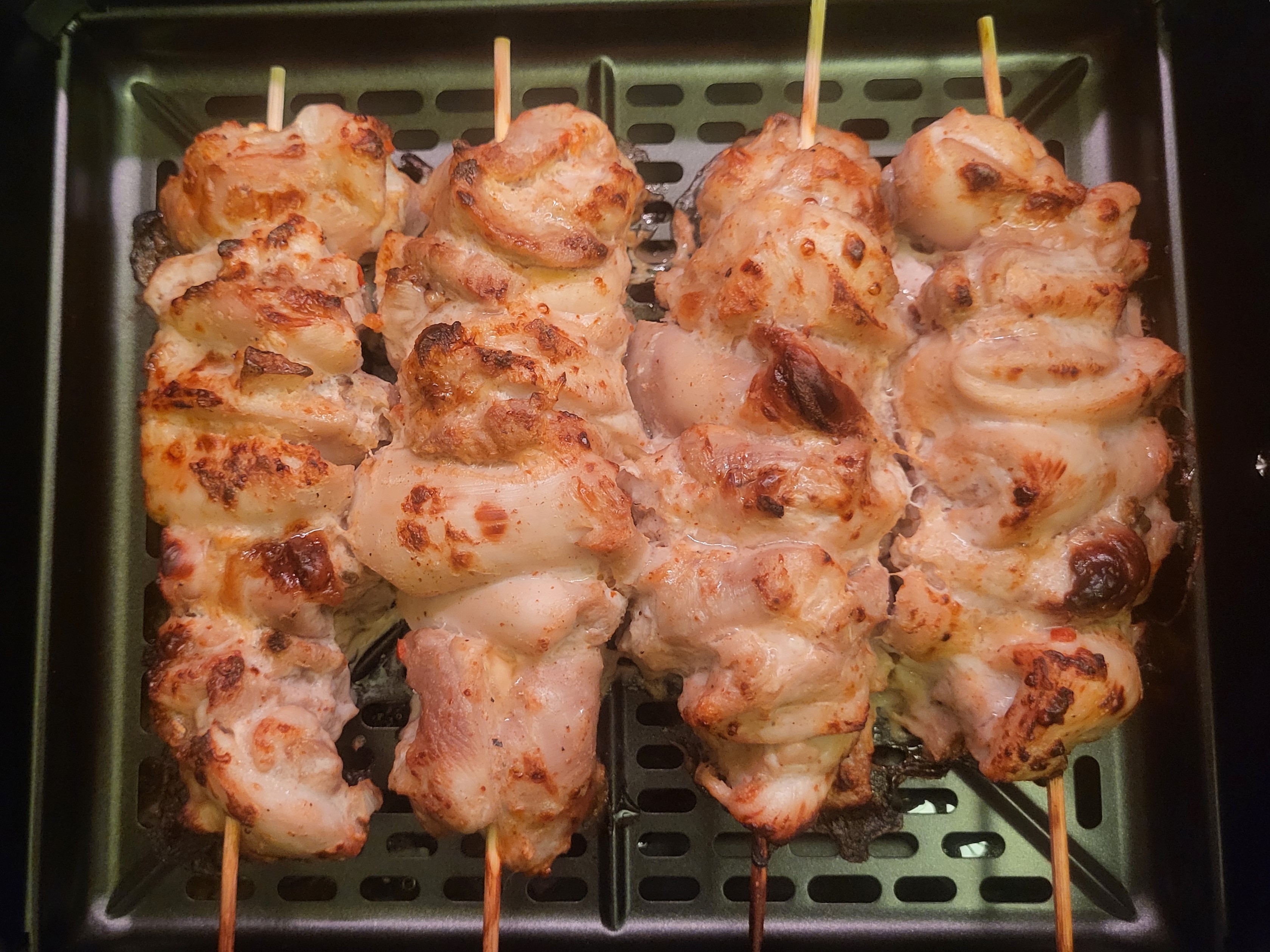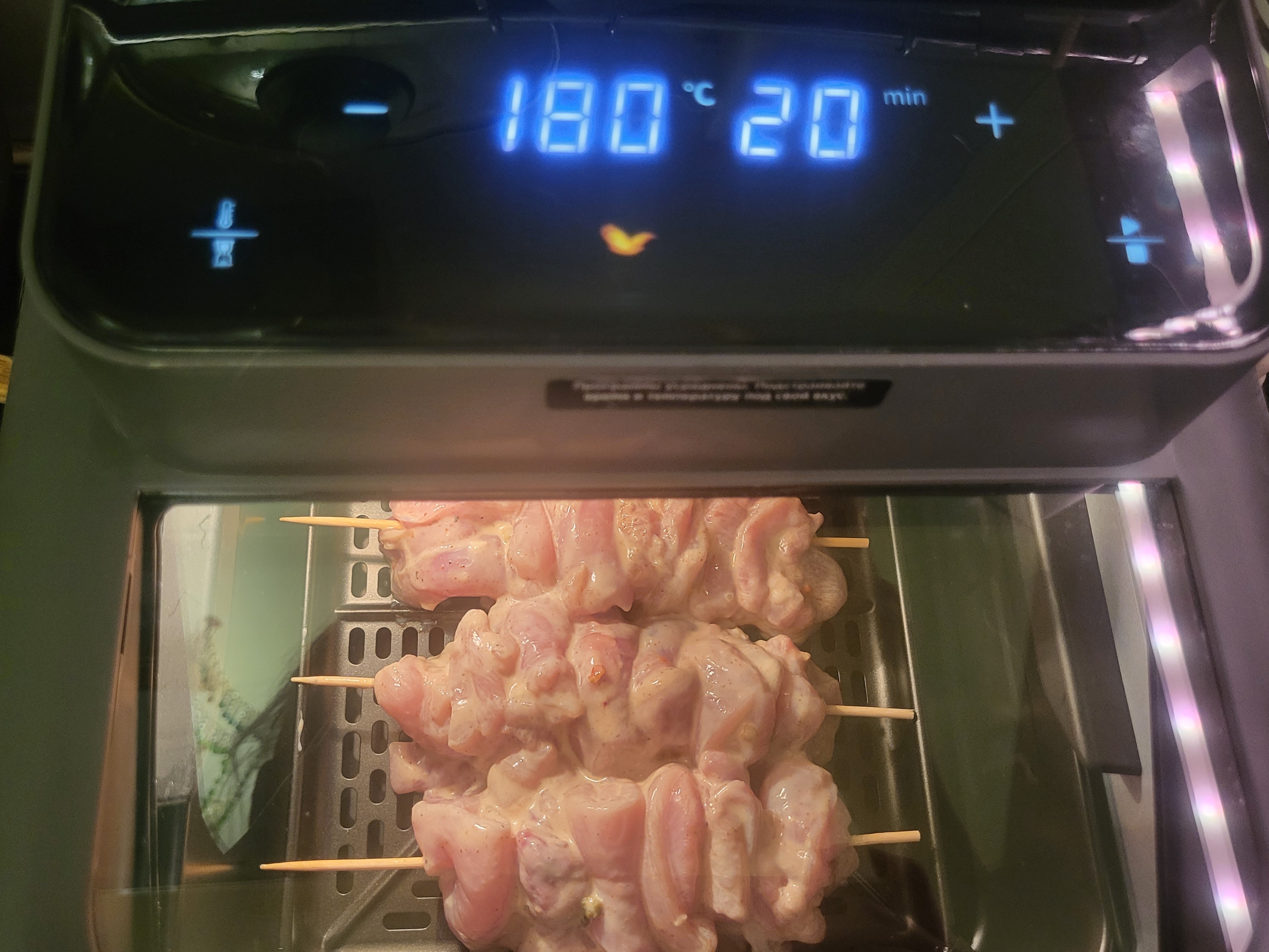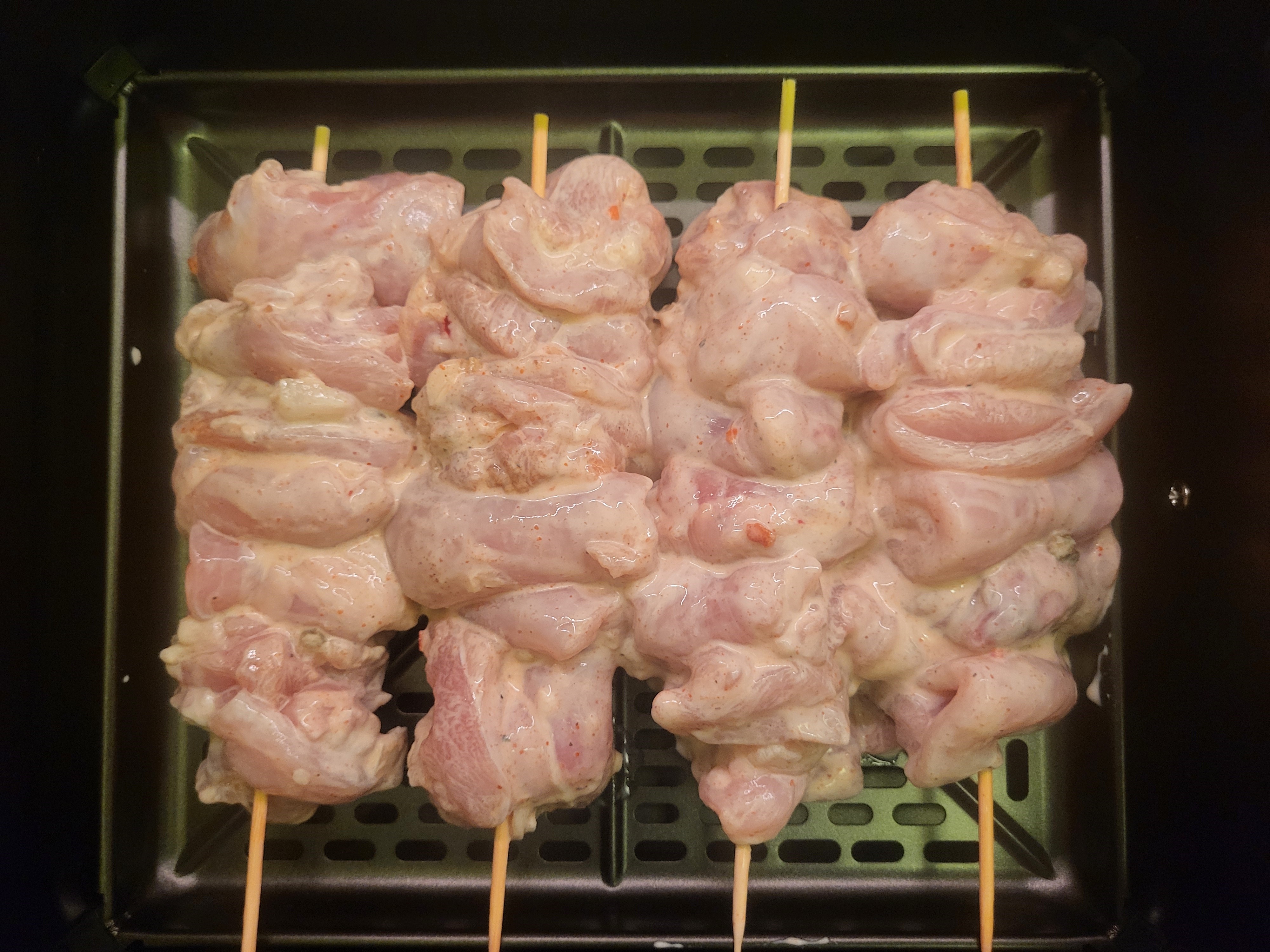 Первое, о чем мы вспомнили, получив аэрофритюрницу на тесты — что у нас есть деревянные шпажки. Поэтому мы решили сделать шашлык, но из курицы.