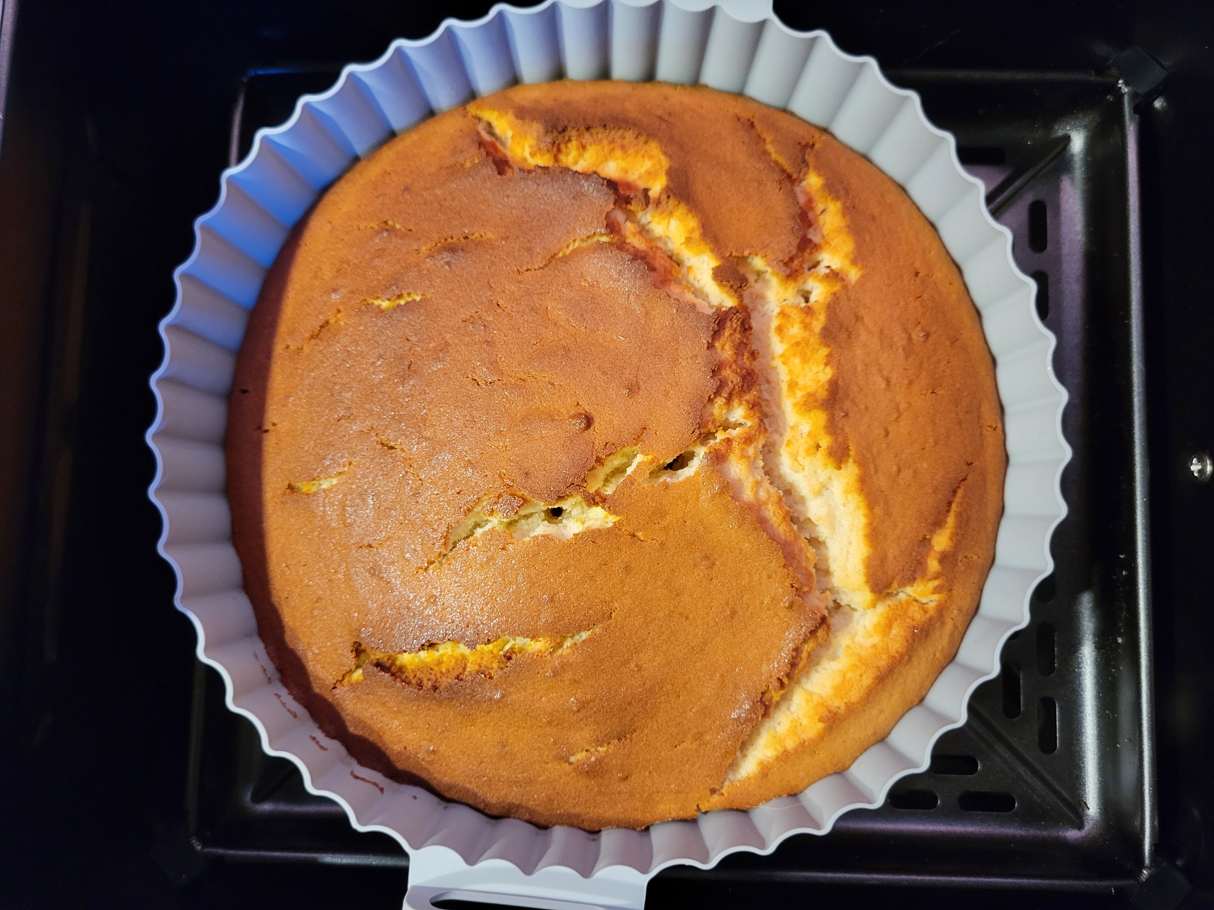 Мы поставили форму в чашу аэрофритюрницы и вылили в нее тесто.