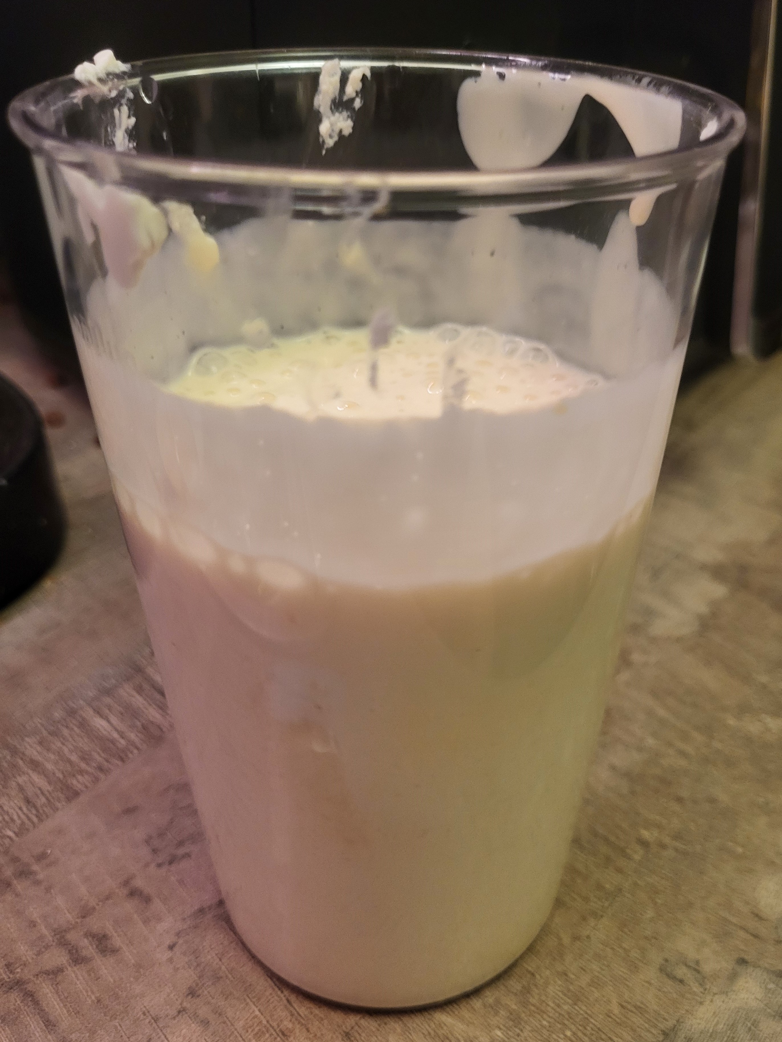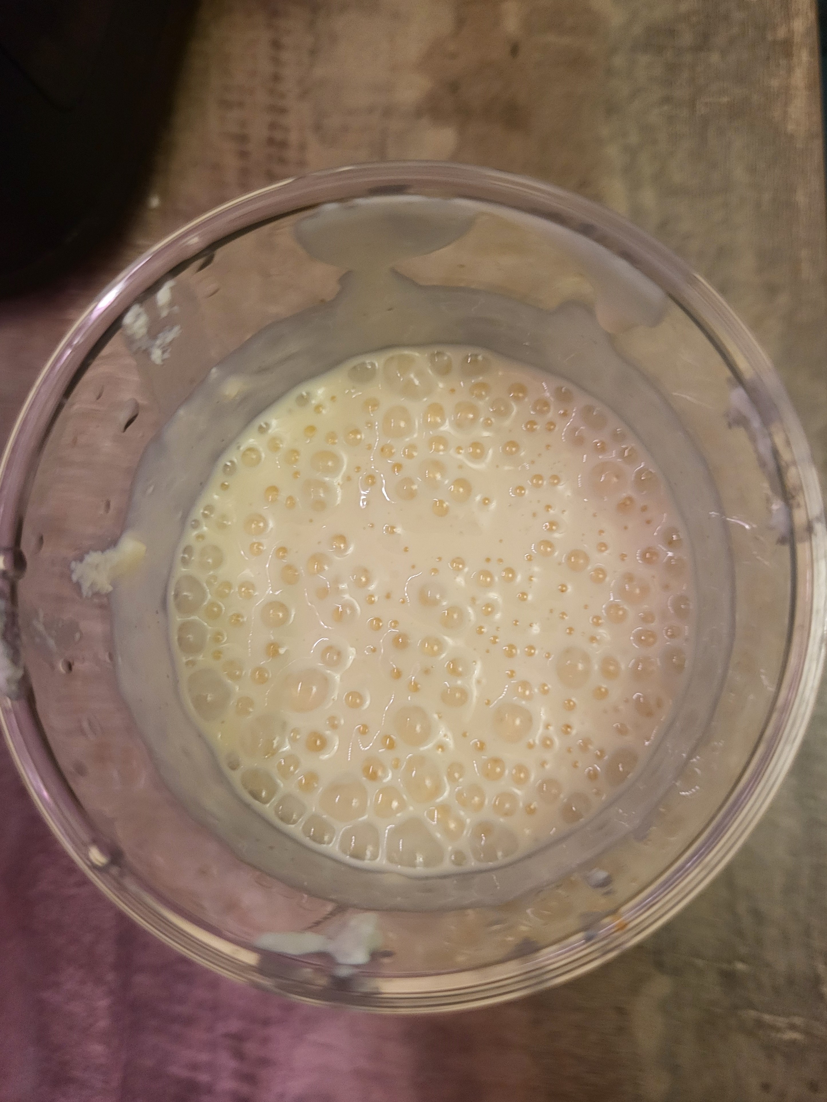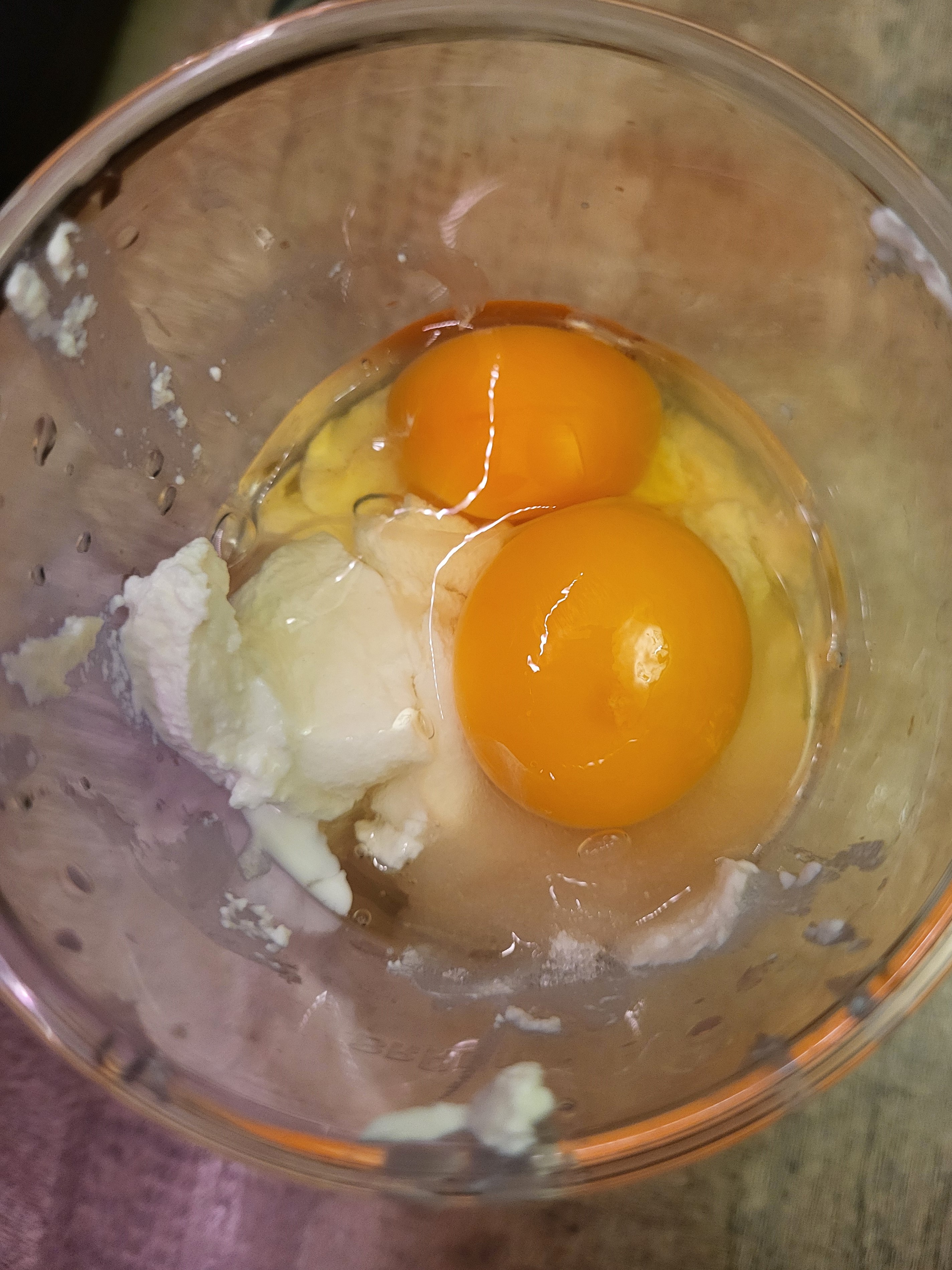 Все ингредиенты для приготовления сырников мы выложили в высокий стакан и пробили погружным блендером.