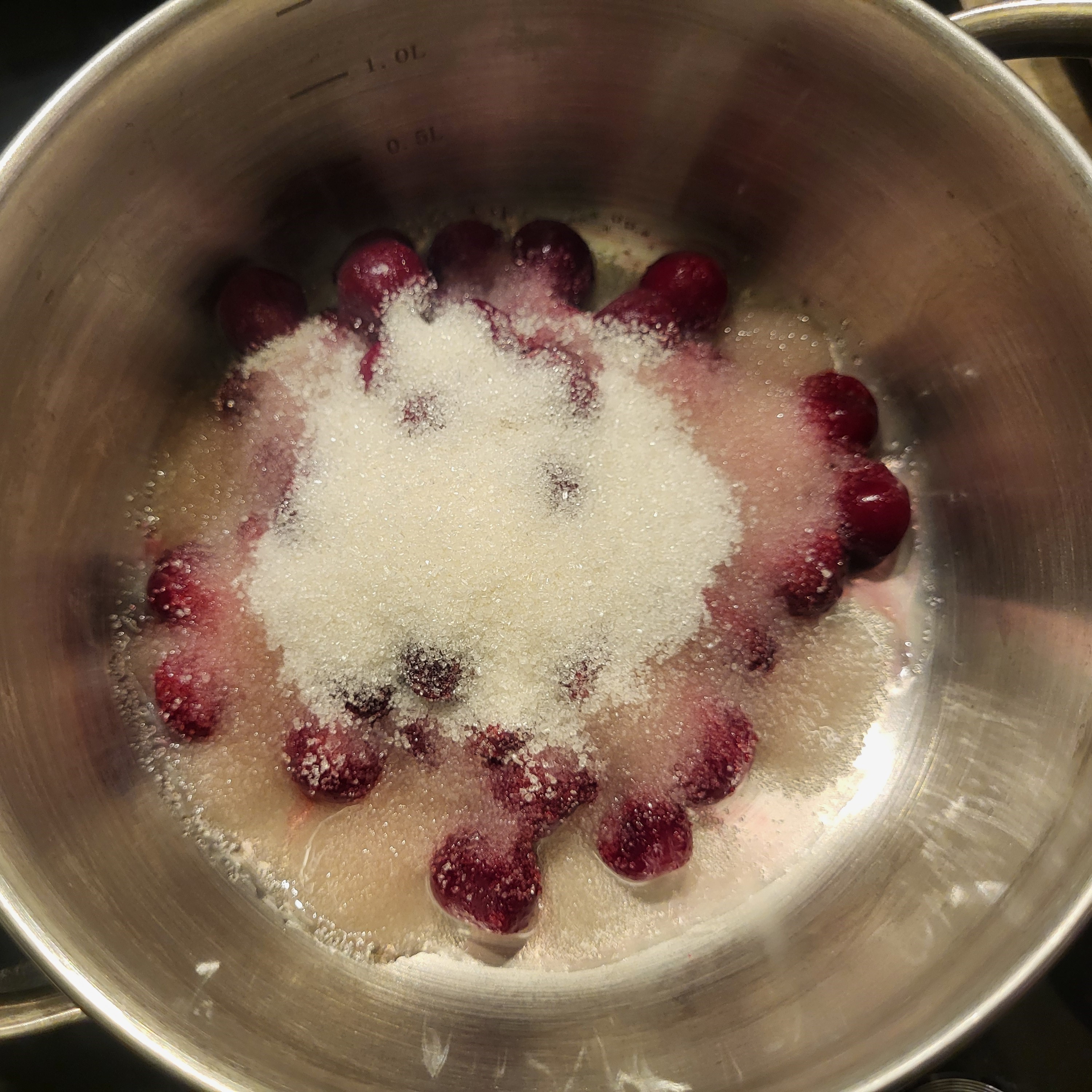 - Выкладываем замороженную вишню в разогретый сотейник и немного провариваем.