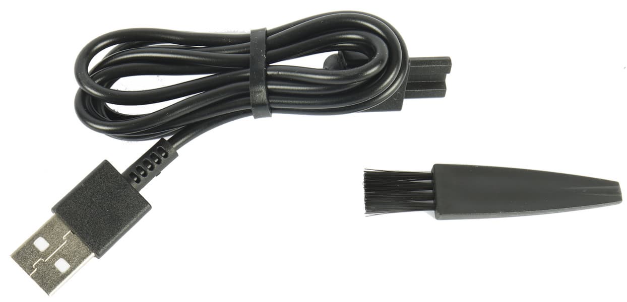 Как мы видим, комплектация у машинки вполне стандартная: производитель позаботился о том, чтобы положить всё необходимое для начала эксплуатации и ухода за устройством. Зарядного устройства мы, впрочем, не обнаружили, однако это и неплохо: увеличивать количество маломощных USB-зарядок в доме уже давно не хочется. А мощный зарядный адаптер тут попросту не нужен.