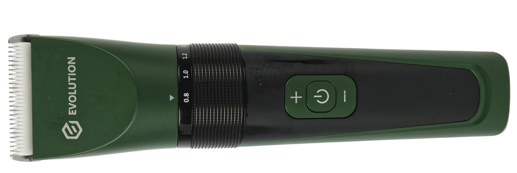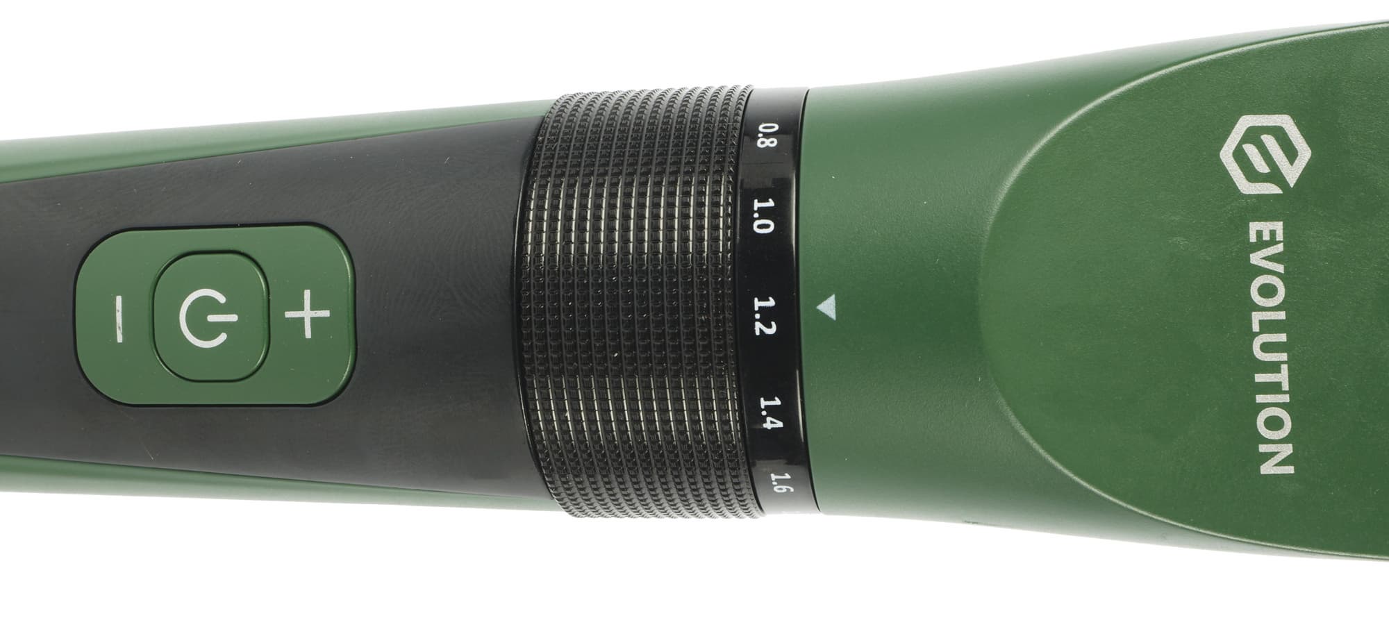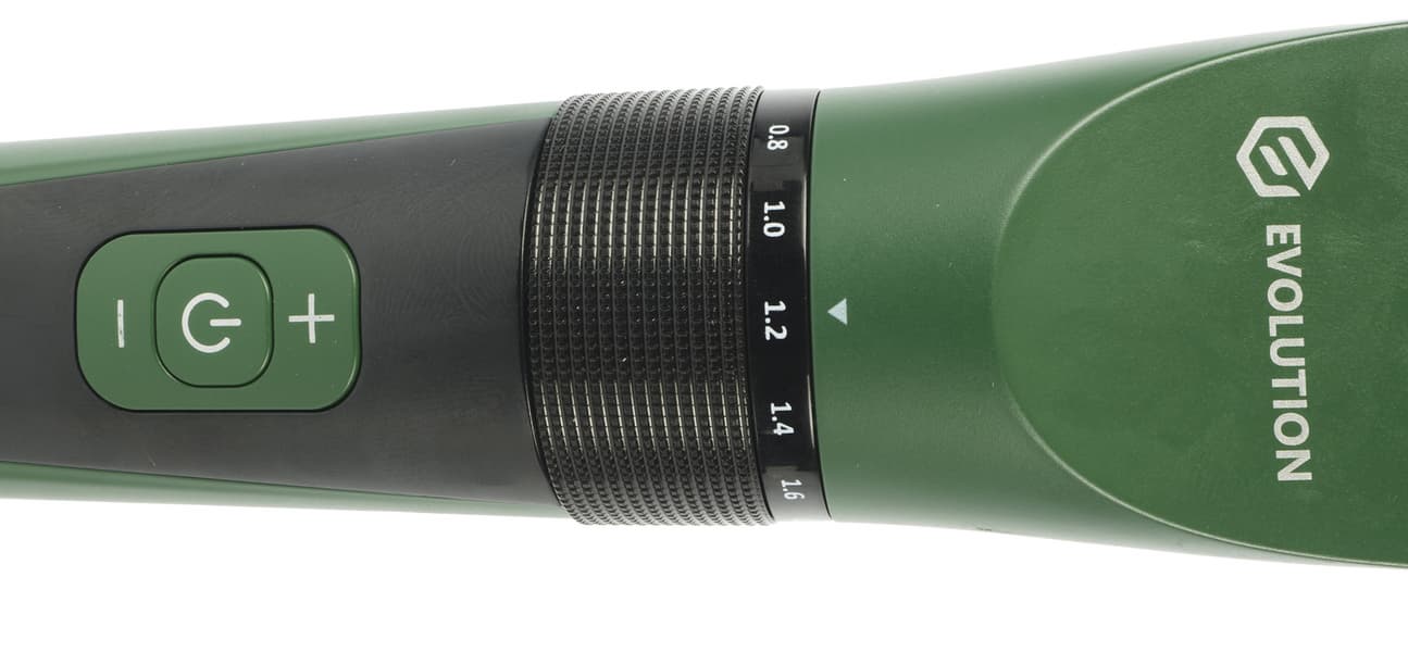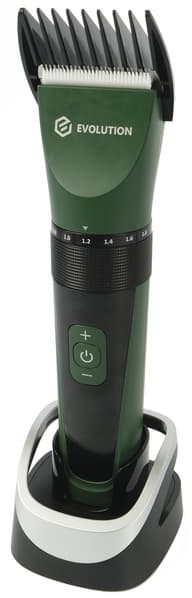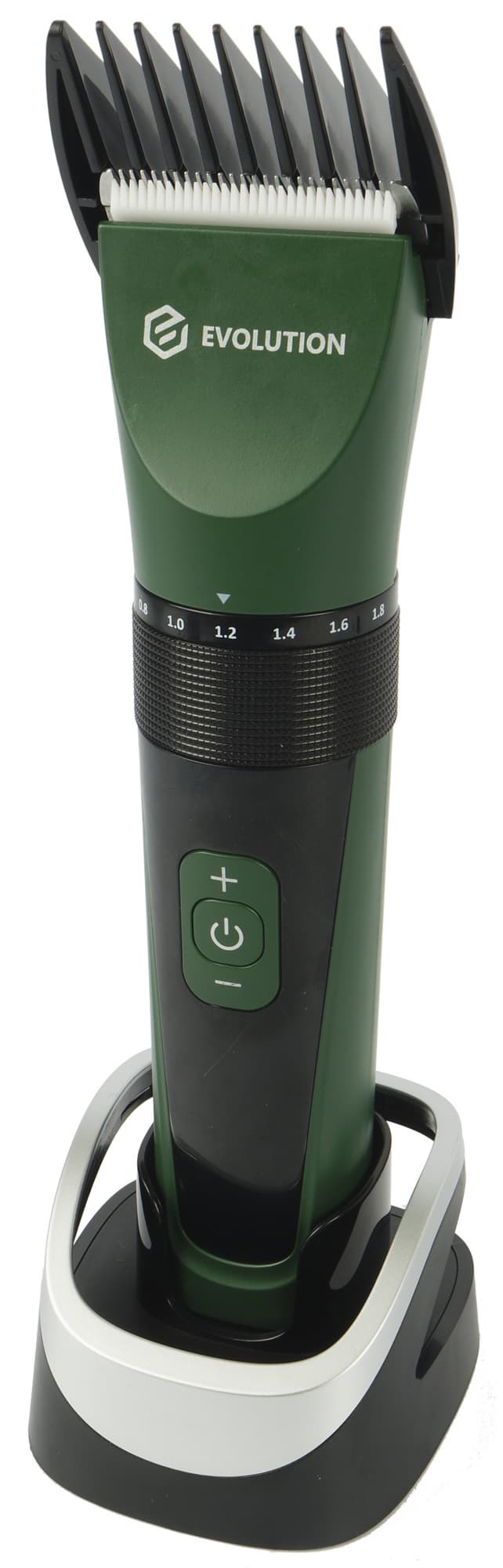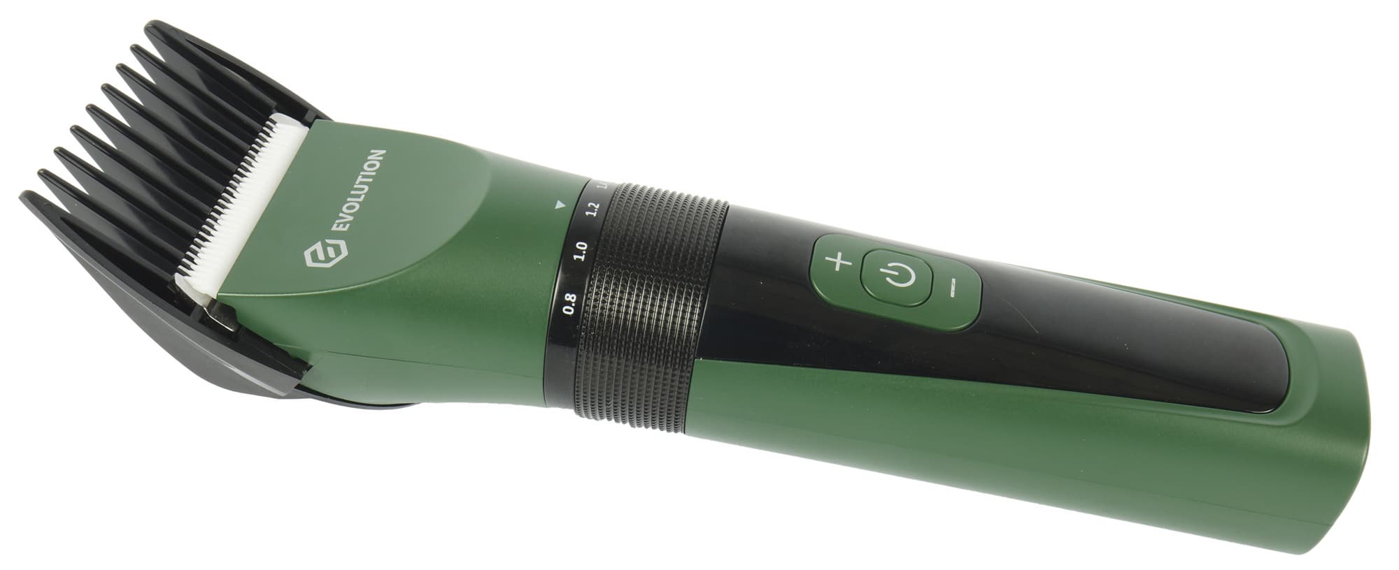 На лицевой стороне мы видим логотип Evolution, под ним — кольцо регулировки длины стрижки при работе без гребней, еще ниже — блок из трех кнопок, а под ним за затемненным пластиком прячется светодиодный дисплей, отображающий состояние прибора и уровень заряда аккумулятора.