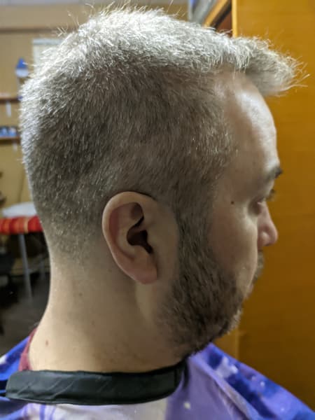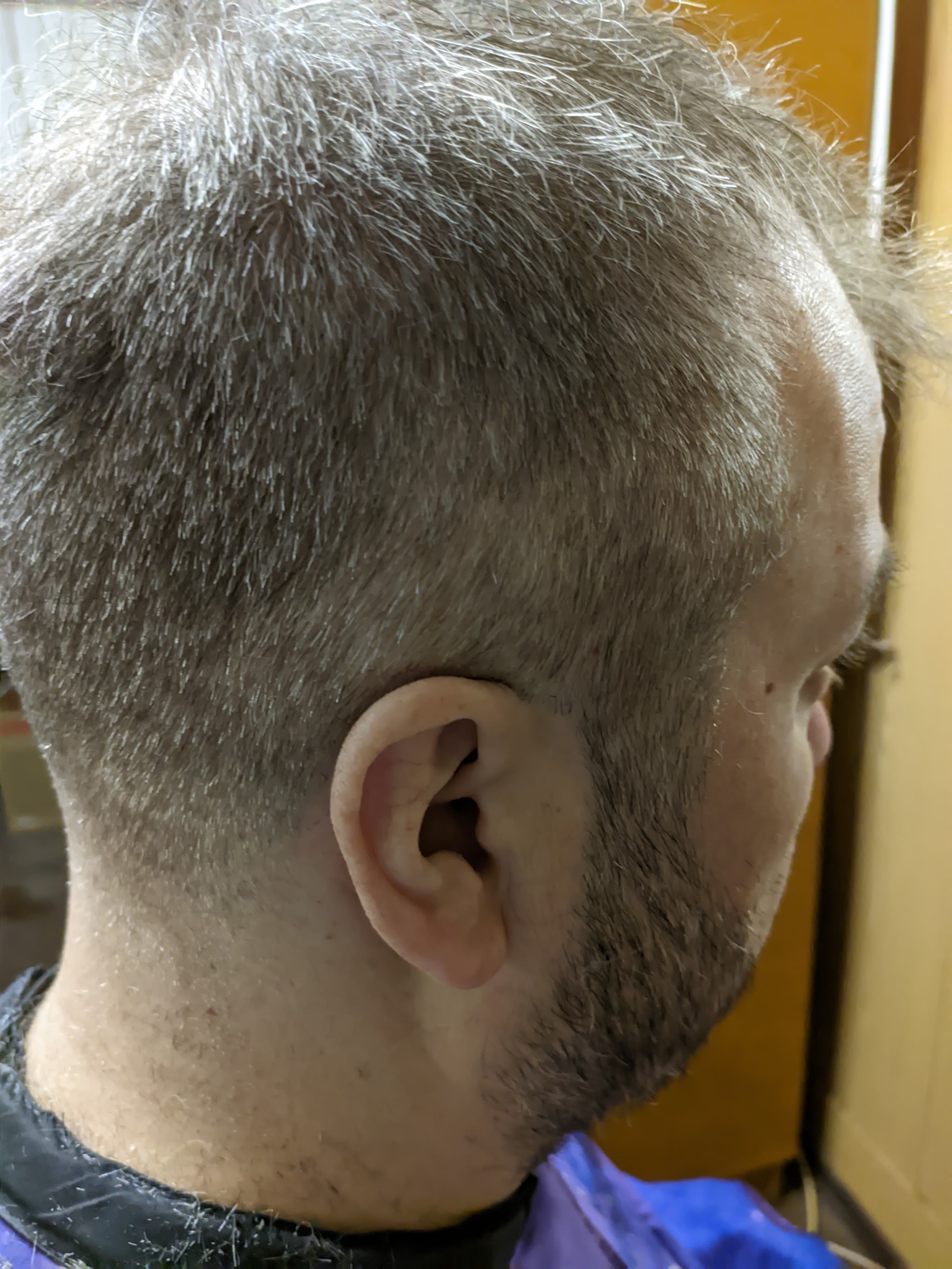 Как видите, нам без труда удалось постричь и шею, и виски, и зону рядом с ушами. Машинка работает уверенно, срезает волосы с первого прохода, не дергает отдельные волоски. Стрижка проходит комфортно.