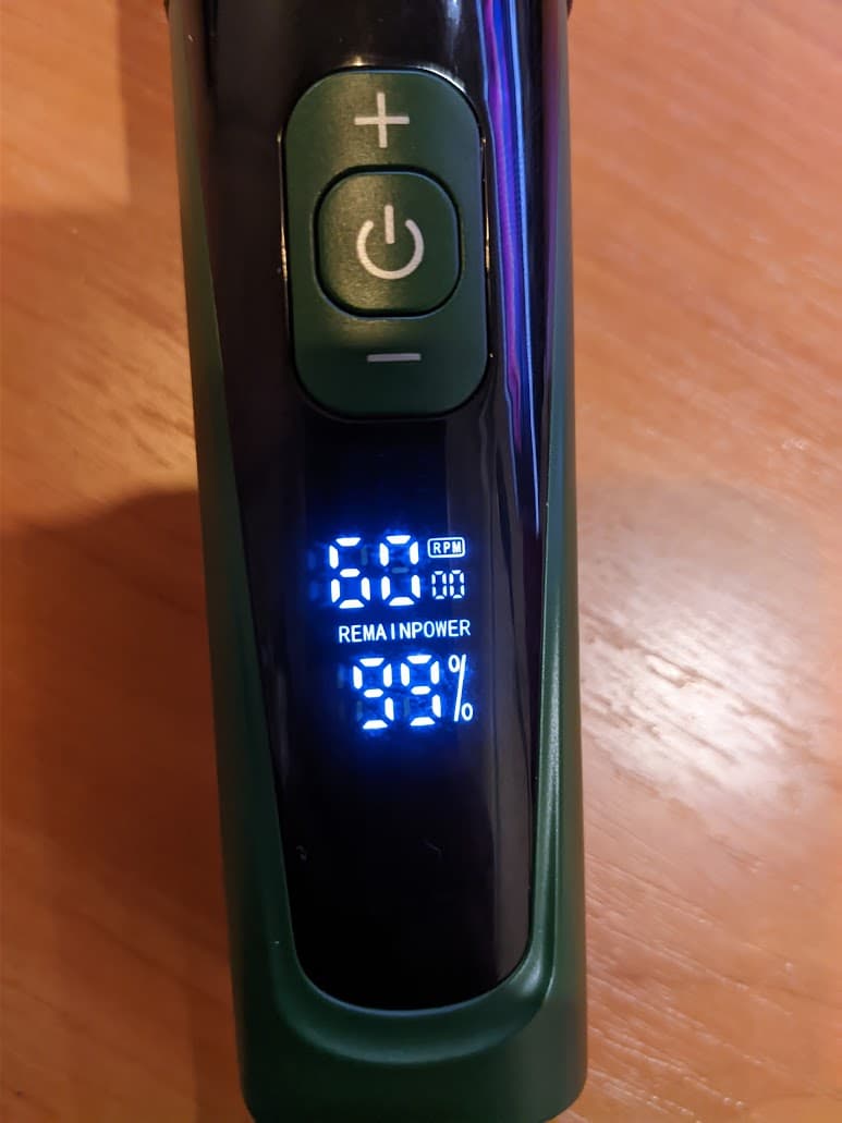 Центральная кнопка отвечает за включение и отключение машинки. Кнопки «+» и «−» позволяют изменить скорость работы мотора. При включении скорость всегда устанавливается на отметке 6000 оборотов в минуту. Значения, доступные для пользователя, составляют 5000, 5500, 6000, 6500 и 7000 оборотов в минуту. Выбранный режим и оставшийся уровень заряда аккумулятора во время работы машинки отображаются на светодиодном дисплее. Красный индикатор, напоминающий о том, что устройство пора подзарядить, загорается на отметке в 25% заряда.