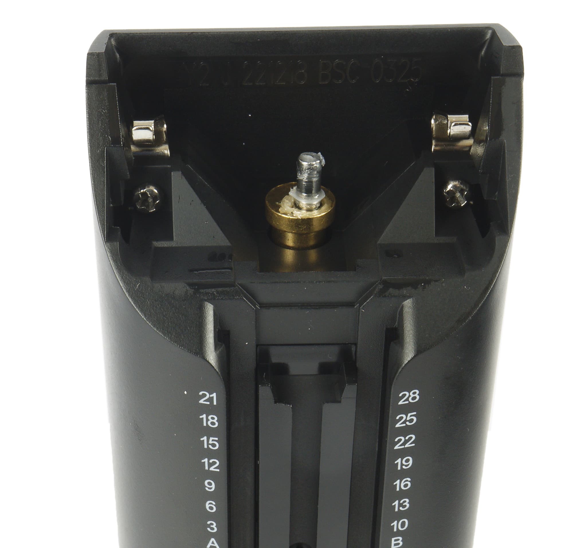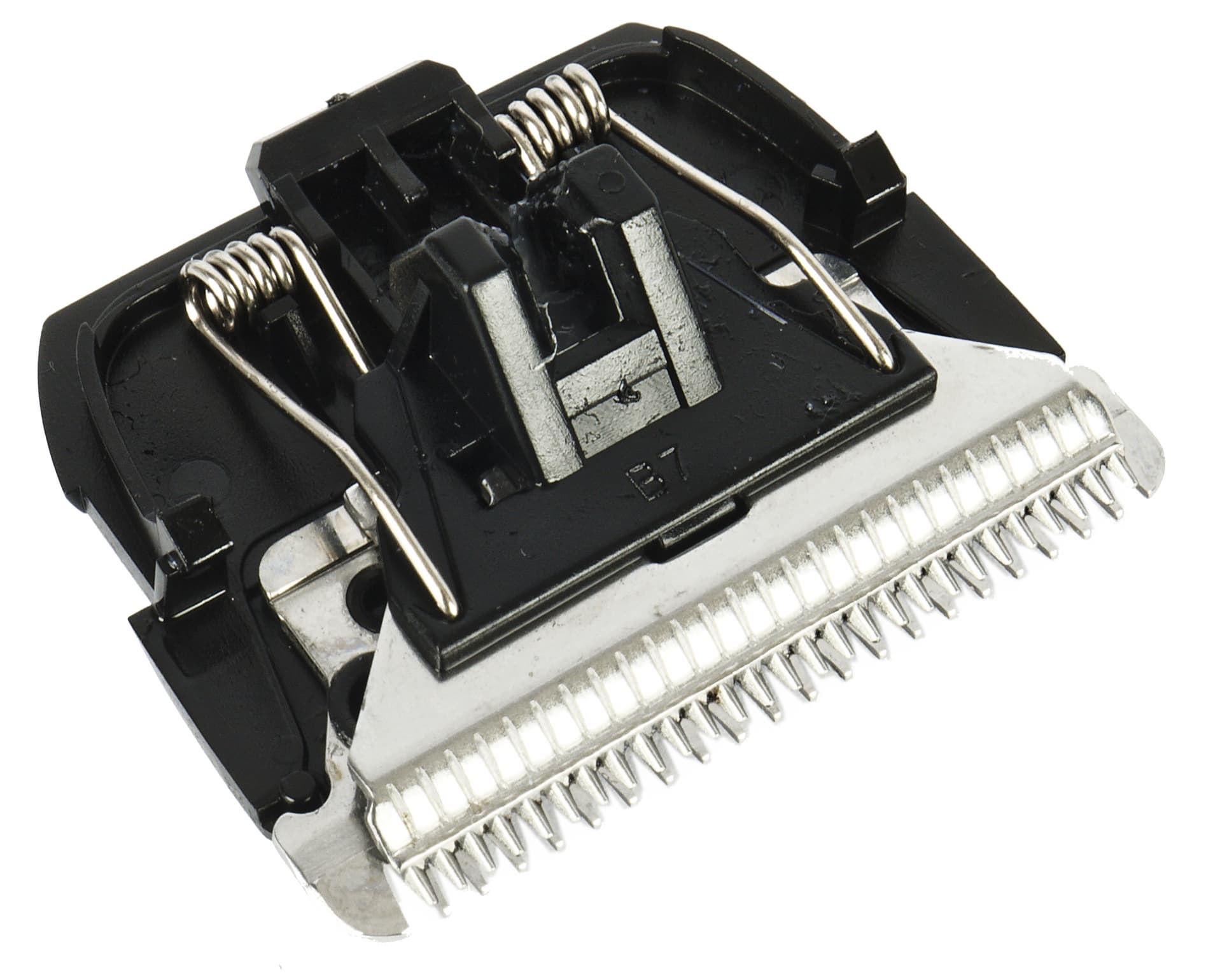 Спереди, с тыльной стороны, находится разъем для установки плавающих гребней. Справа и слева от него нанесены цифровые значения, соответствующие выбранной длине стрижки. Слева — для гребня с маркировкой А, справа — для гребня с маркировкой B.