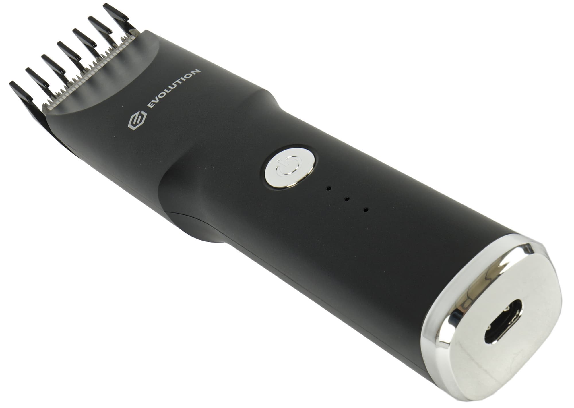 На лицевой стороне мы видим логотип Evolution, над ним — кнопку включения, а еще ниже — три белых светодиодных индикатора.