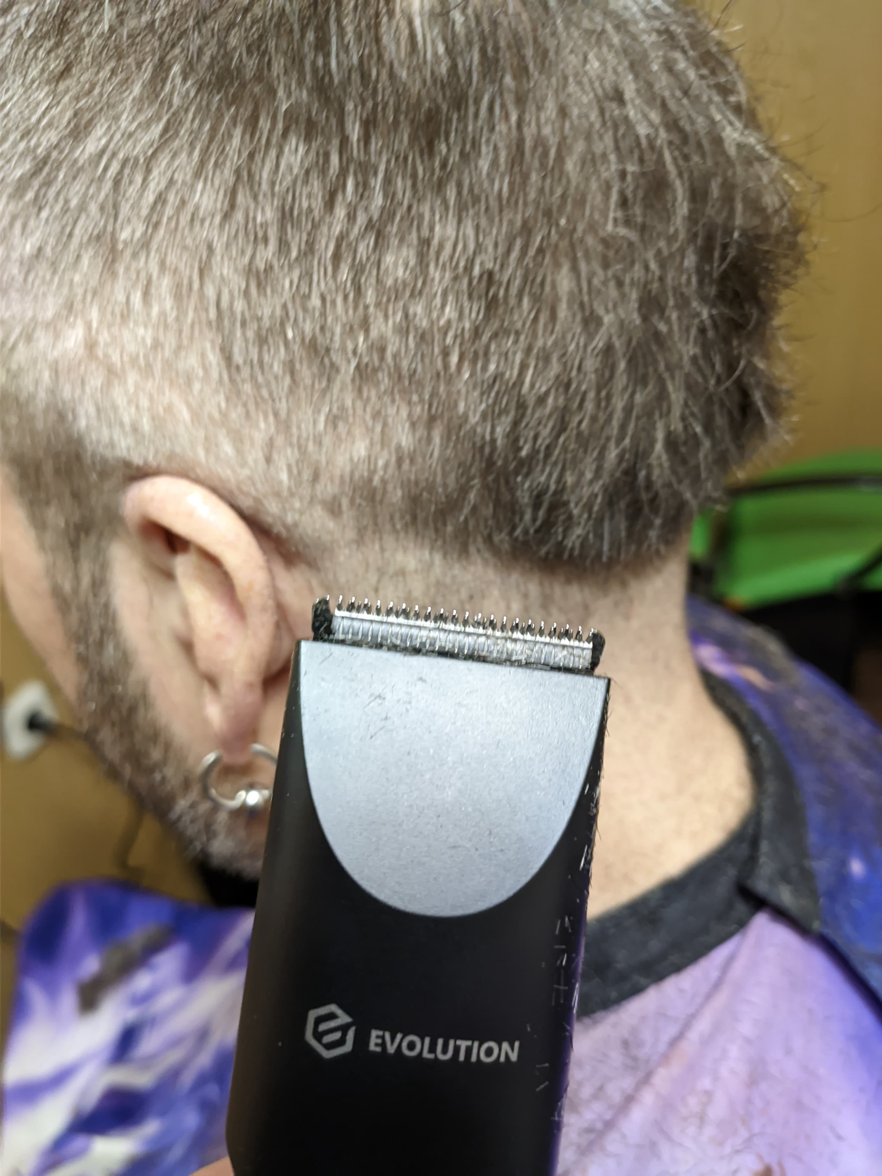 В ходе тестирования мы использовали сразу две машинки (вторая — также Evolution, более старшая модель Barber Full control). При этом старались чтобы зоны ответственности машинок не пересекались: с одной стороны головы работали одной машинкой, с другой — второй. На фотографиях работа устройства отражена с левой стороны головы (если в комментариях не указано обратное).