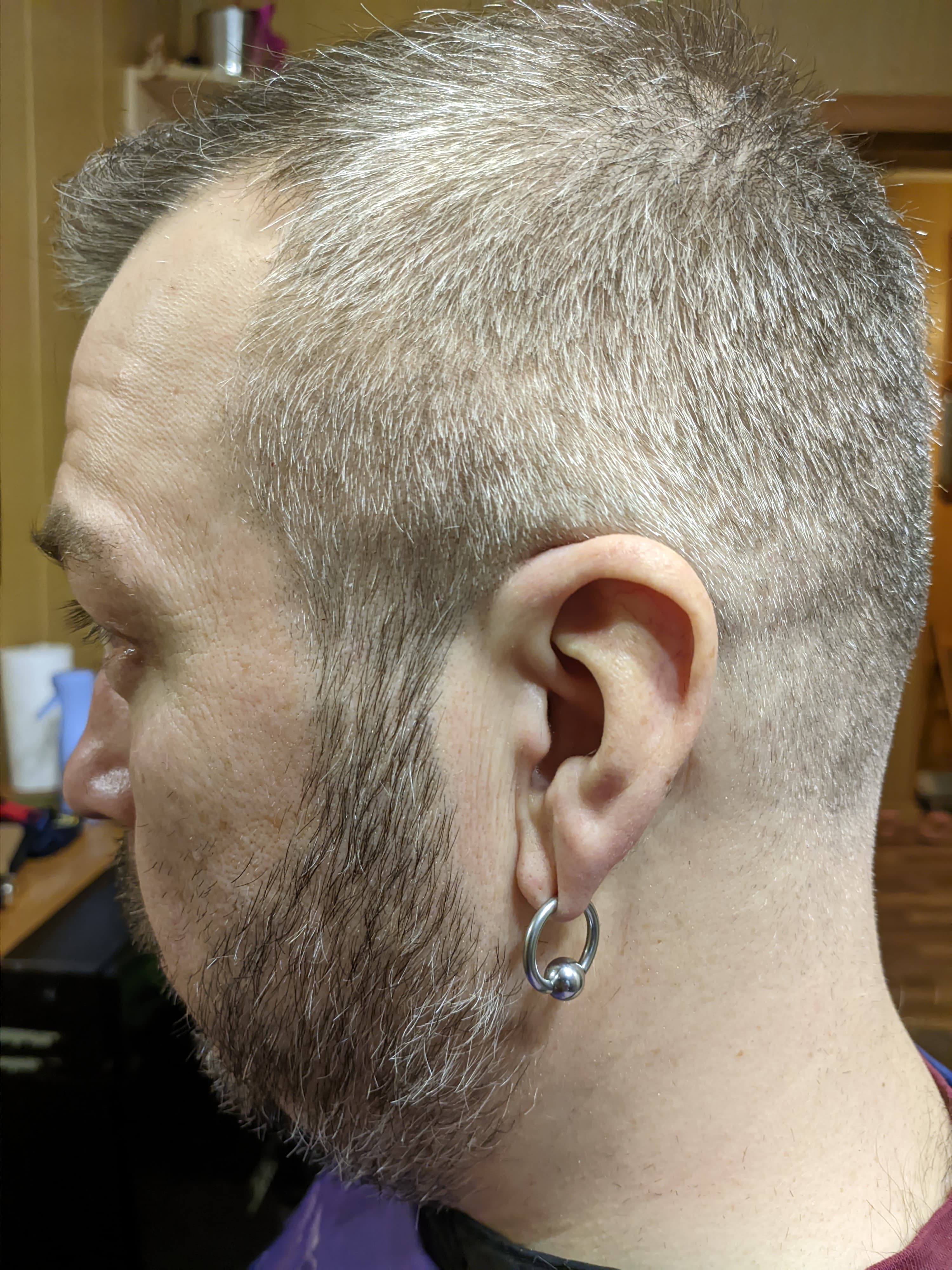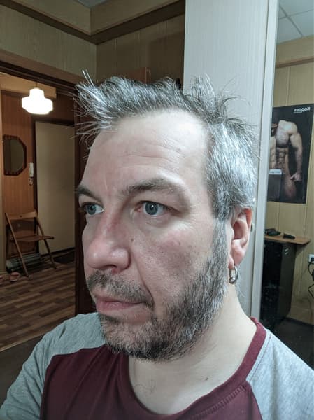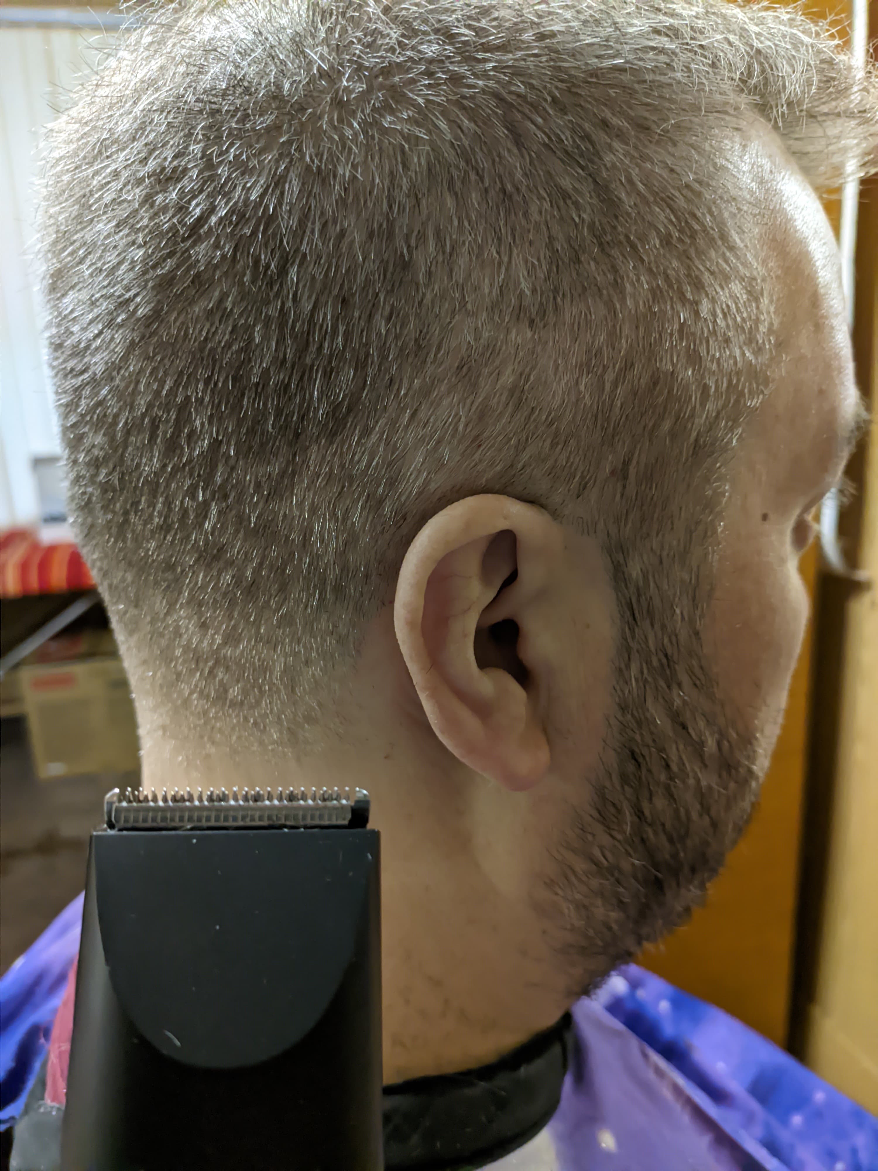 Что ж, начало положено. Пока что все идет хорошо. Машинка работает уверенно, срезает волосы с первого прохода, не дергает отдельные волоски. Стрижка проходит комфортно.